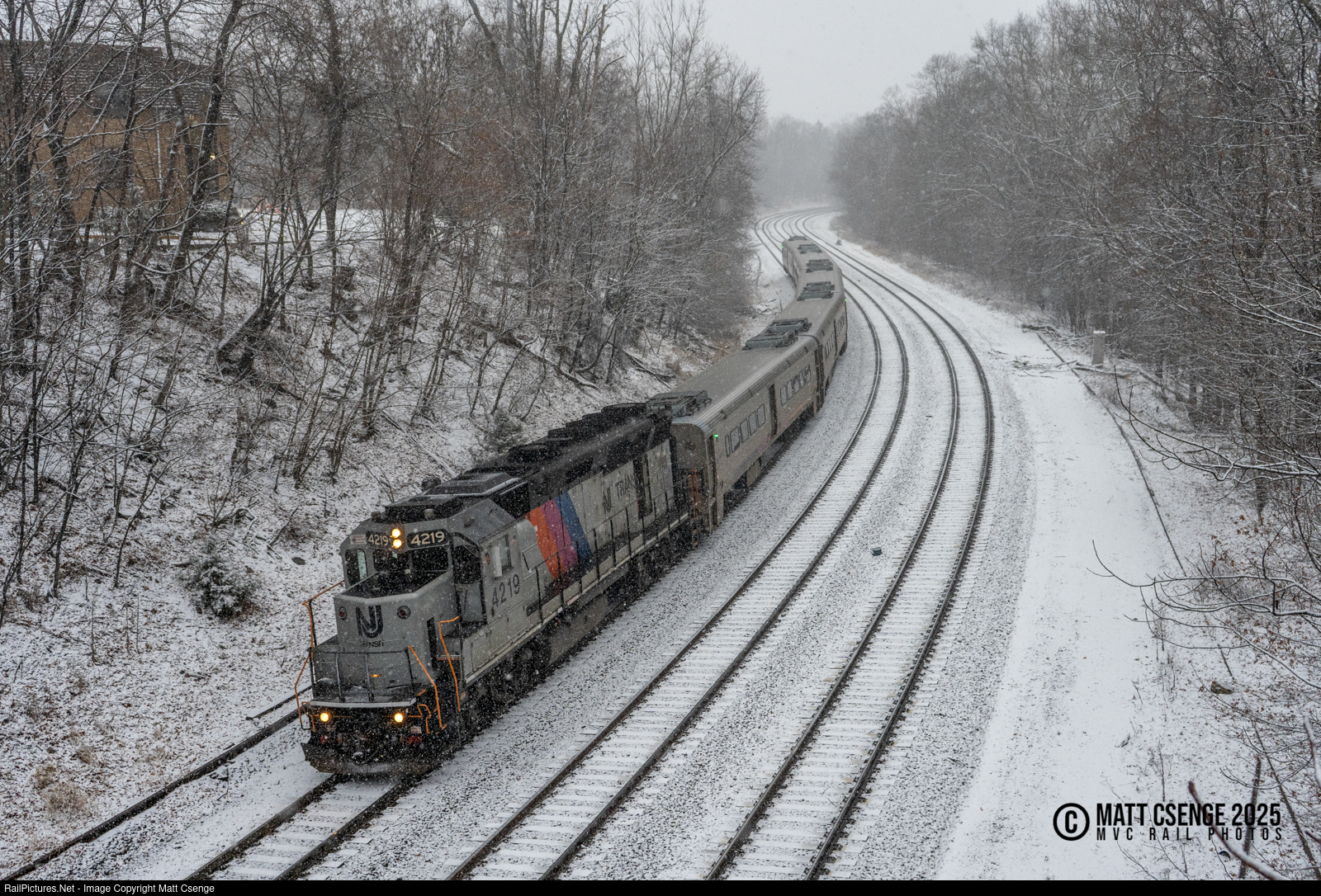 NJ Transit GP40PH-2B no. 4219 is seen leading Bergen County Line train 1871 through the curves east of Waldwick Station as heavy snowfall coats the area. |