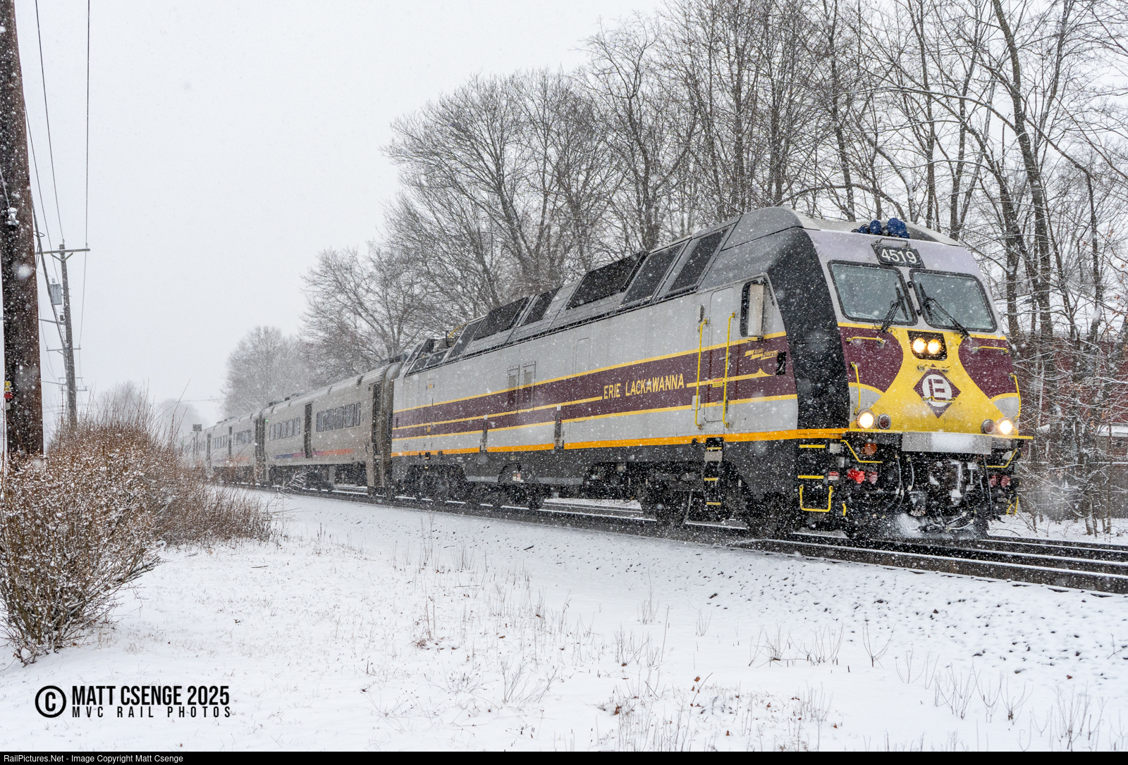 Lackawanna in the Snow. NJ Transit ALP-45DP no. 4519 is seen leading Main Line train 1721 along Route 202 as it nears its final station: Suffern, NY.
