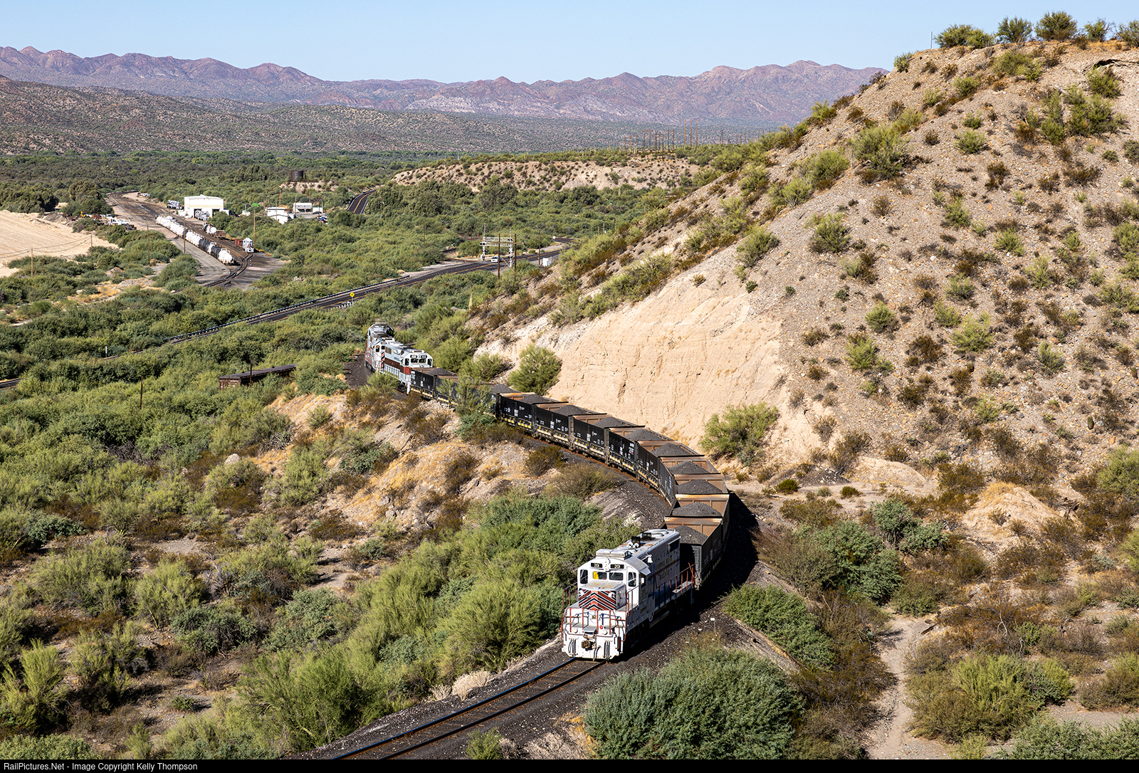 | Now loaded, the smelter job goes back down the hill with GP18 201 on the rear of the train. To the left is Copper Basin's Hayden Yard where all their trains originate out of. |