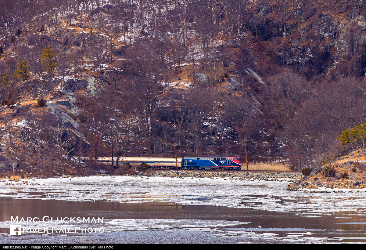 One Two Five On 1/25. Amtrak Train 290 (Ethan Allen Express) was led by AMTK 125 (P42DC, Phase VII) on the afternoon of Saturday, January 25, 2025, seen here passing though the Town of Cortlandt on the eastern shore of the Hudson River. The locomotive wears the newest Amtrak paint scheme, a lively combination of red, white, and blue that is applied to not only the new Siemens ALC-42s, but also the older GE P42s as they go through repair and overhaul at the railroad's Beech Grove shop. Though diesels were once a rare sight on Empire Service trains, they have become slights more common as current service requires additional power to double end trains in order to turn them on the platform in Penn Station.