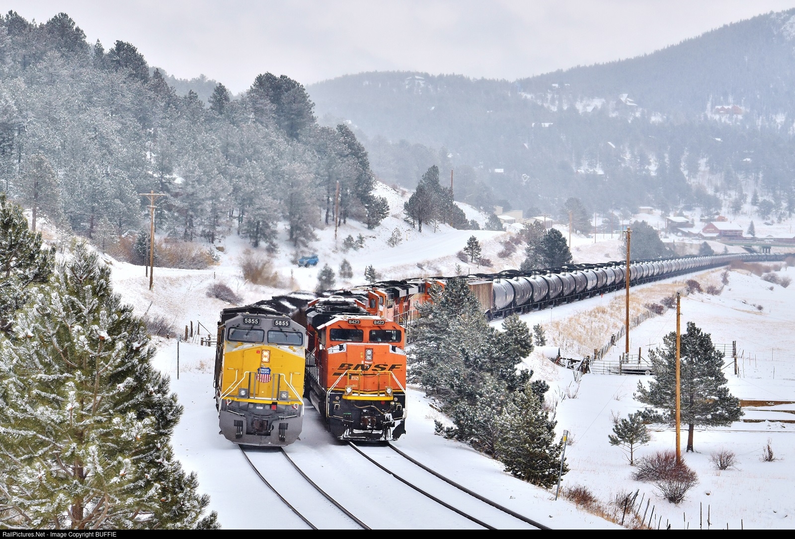 UP 5855 (AC4400CW-CTE) shoves a loaded coal train past a BNSF oil can train waiting on a siding at a snowy Rollinsville, Colorado.