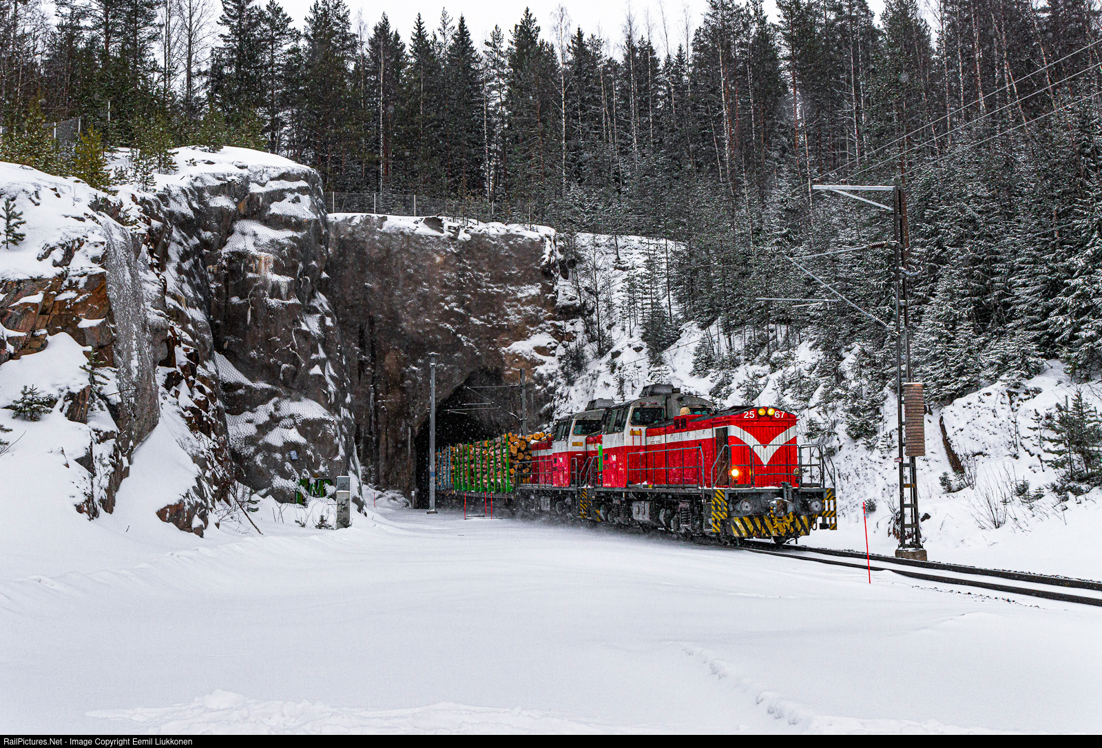 | Like a horn of an ocean liner, the tunnel of the Pieni Neulamäki spreads loud sound in the cold scenes of Finland. Soon the sounds hit in their pinnacle as two class Dv12 diesel locomotive are hauling a timber train to Pieksämäki. |