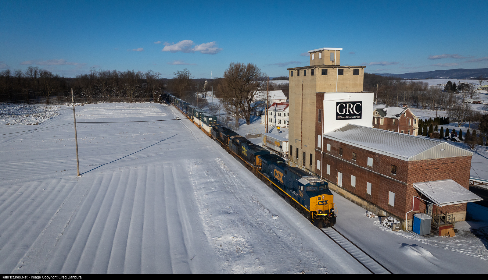 | A freshly rebuilt ES44AH leads an extremely late I115 making a rare late afternoon appearance on the Lurgan Sub a day after a significant snowstorm. The mill in the foreground, home of the Waynesboro Model Railroad Club, has been recently repainted with a new sign for its owner, GRC. |