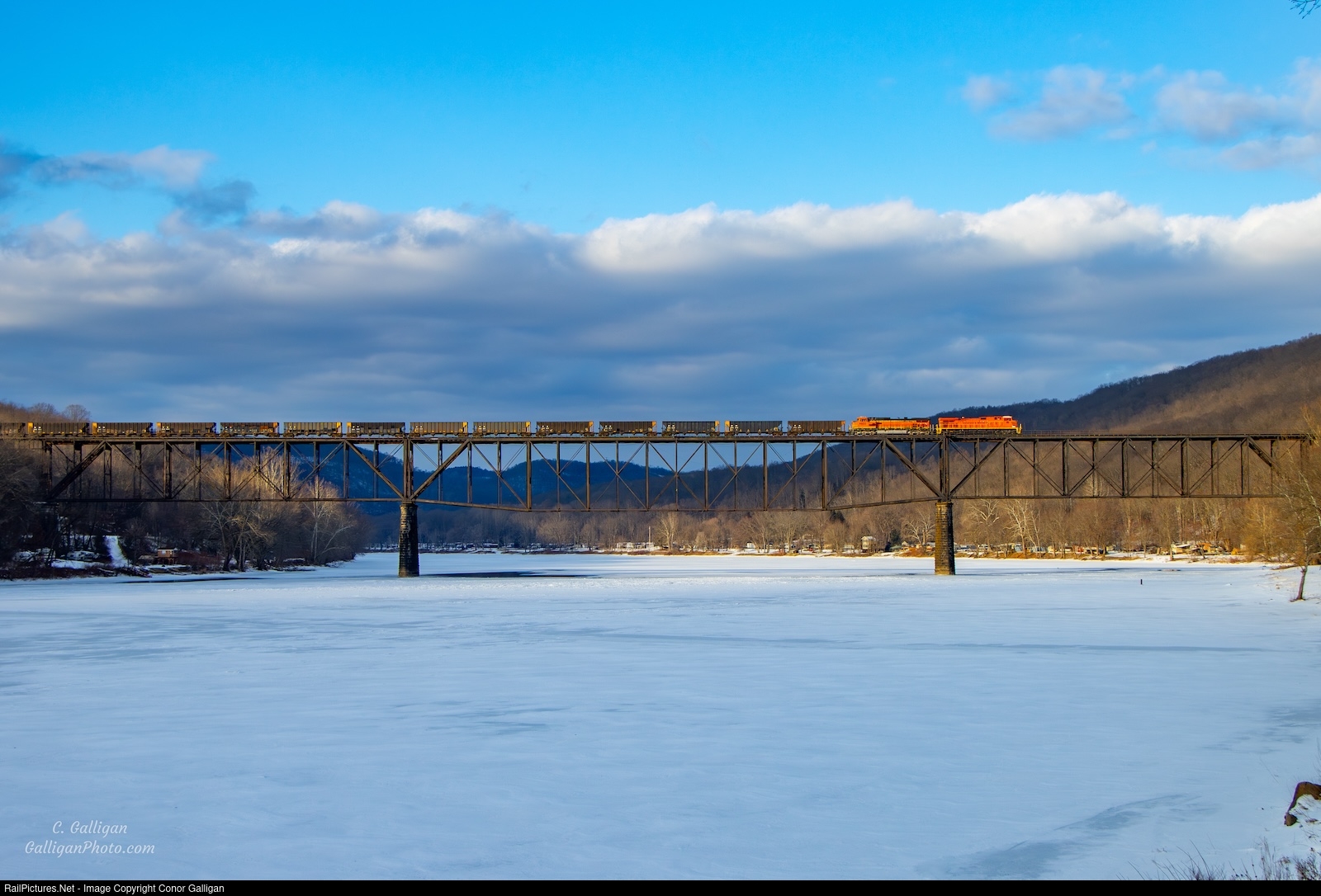 | Buffalo and Pittsburgh's NCRI (empty coal from New Castle) crosses the trestle at Mosgrove on their way to Riker Yard in Punxsutawney, PA. Leading is the G&W Heritage Unit #1899, crossing as the sun slips away from the sky. |