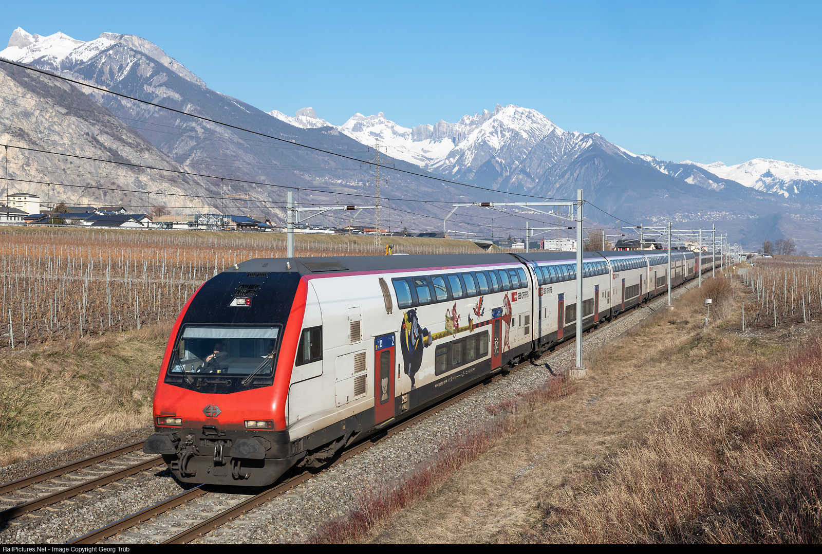 | IR 1822 of the line IR90 from Brig via Sion-Martigny-Montreux-Lausanne to Geneva Airport between Chamoson-St-Pierre-de-Clages and Riddes. Leading is a cab car Bt with family compartment, part of a six car doubledeck push-pull train with Re 460 # 062, followed by 6 single deck standard cars of type IV and Re 460 # 034 in the far rear of the train. |