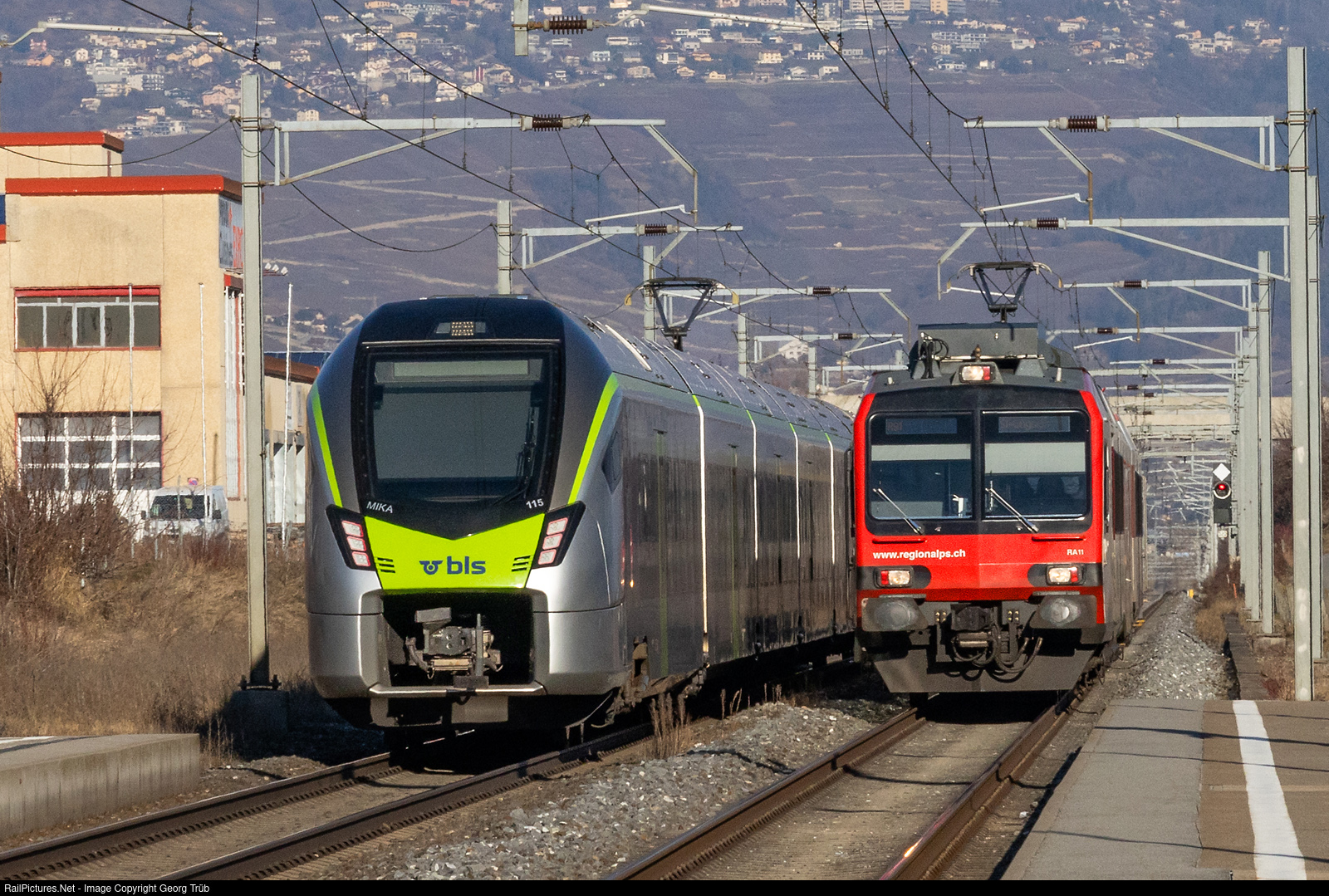 Meeting of two trais of the R91 line in Chamoson-St-Pierre de Clages. On the left "MIKA" RABe 528 # 115 of the BLS, rented by RegionAlps due to shortage of rolling stock, running the R 6121 from St-Gingolph (Suisse) via St-Maurice-Martigny-Sion-Visp to Brig. On the right Domino push-pull train of the RegionAlps with railcar RBDe 560 # 411, running the R 6122 from Brig to St-Gingolph (Suisse).