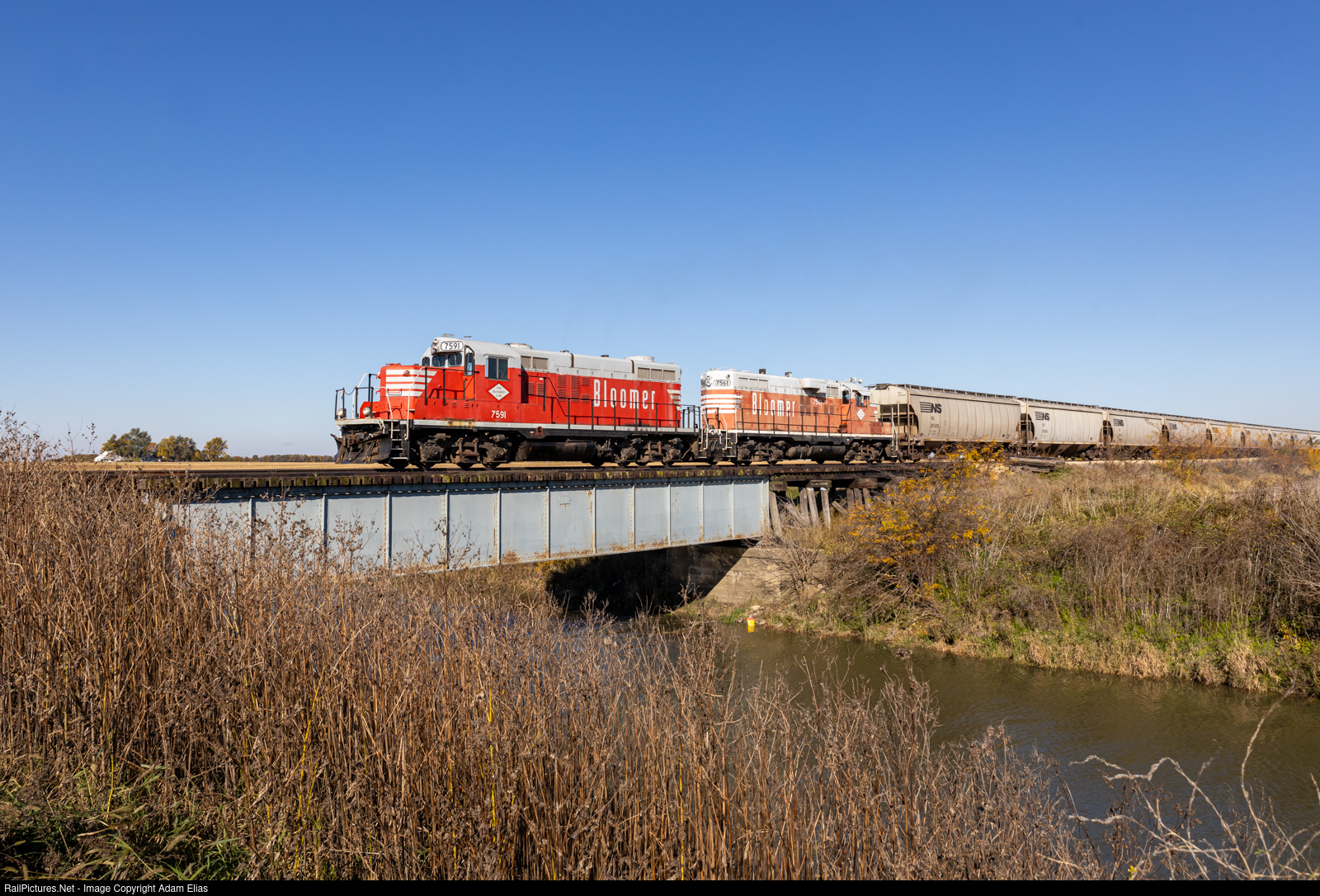 Bloomer 7591 & 7561 bringing grain loads for the NS across the North Fork Vermillion River.