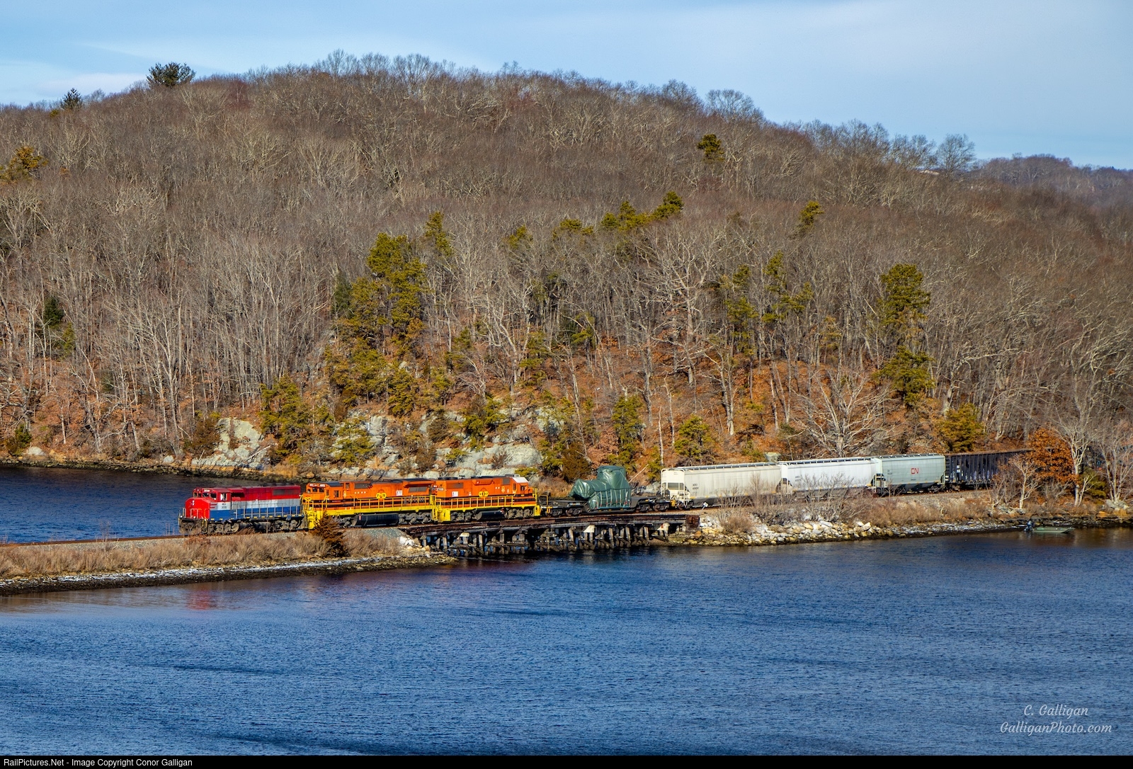 | New England Central 608 crosses over Trading Cove in Uncasville with a Nuclear Heat Exchanger in tow for Groton's General Dynamics. Behind the NECR exRailAmerica SD40 is power borrowed from neighboring Providence and Worcester. |