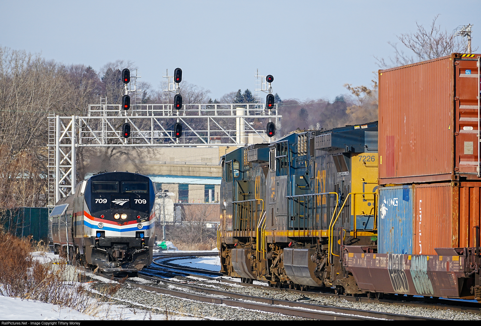The Eastbound Empire Service Amtrak 284 with 5 passenger cars (Niagara Falls, NY to New York, NY) passes the Westbound CSX I169 (Port Newark, NJ to Chicago, IL) who prepares to depart the CSX Dewitt Yard on Saturday morning.
