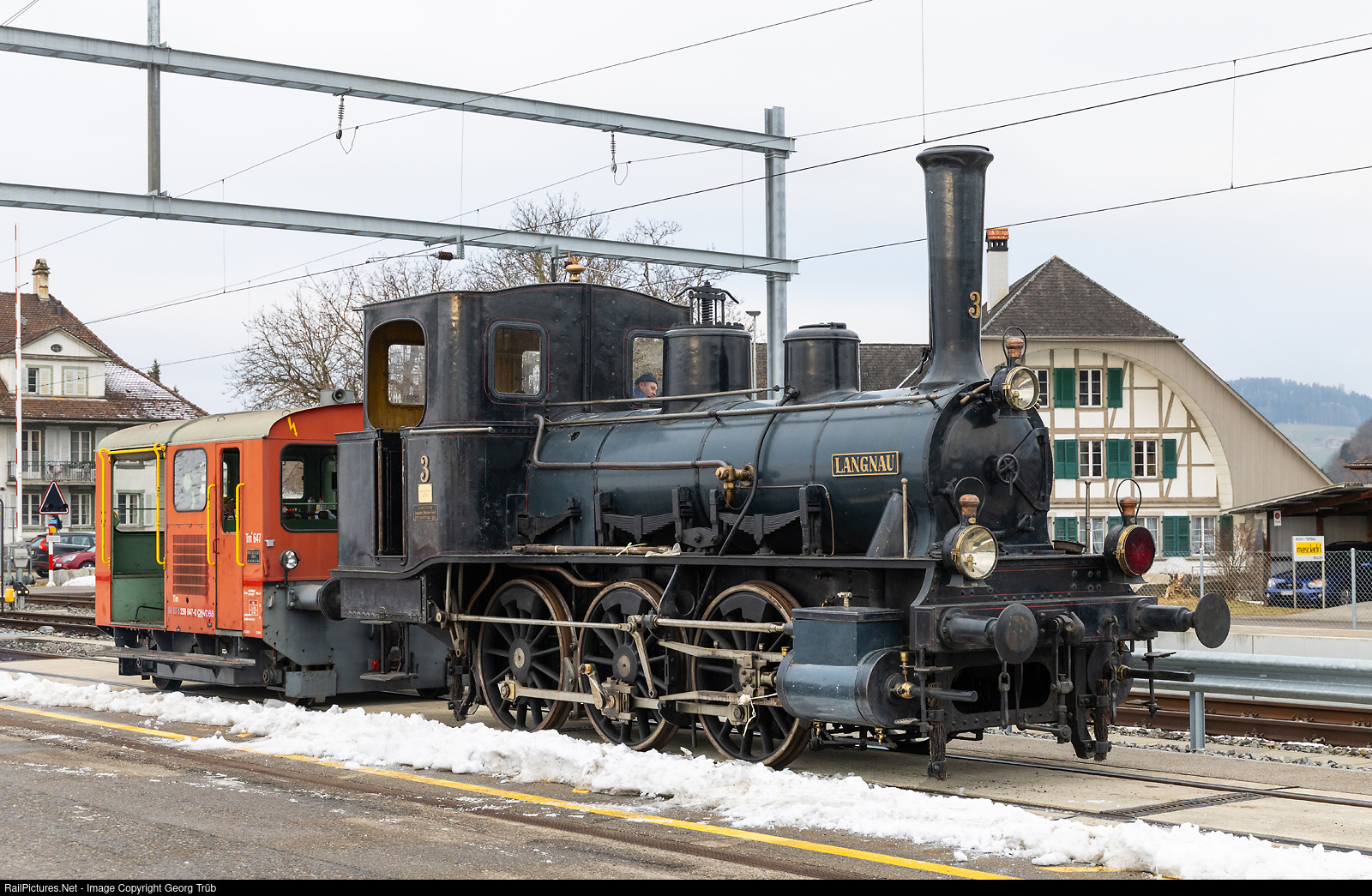 On this day, the 144-year-old steam locomotive Ed 3/3 # 3 “LANGNAU”, built in 1881 by SLM Winterthur for the Emmental Railway, was transported from the Swiss Museum of Transport's external storage facility in Rain to the Emmental and unloaded in Biglen. From there, it continued by rail to the workshop of the Bern Steam Railway in Konolfingen, where the locomotive will be restored to working order by May 2025. The locomotive comes from the Dr. Ernst Dübi Foundation of the Swiss Museum of Transport (VHS) and was handed over to DBB under a 5-year loan agreement. The 150th anniversary of the Emmental Railway will be celebrated on May 17/18, 2025. Locomotive Ed 3/3 # LANGNAU in Biglen after the arrival and back on the tracks of the former Emmental railway. On the left diesel shunter (Tm II) Tm 230 # 647 of the VDBB (Verein Dampfbahn Bern), built in 1958 by RACO (Aebi) for the SBB and taken over by the DBB in spring 2024..