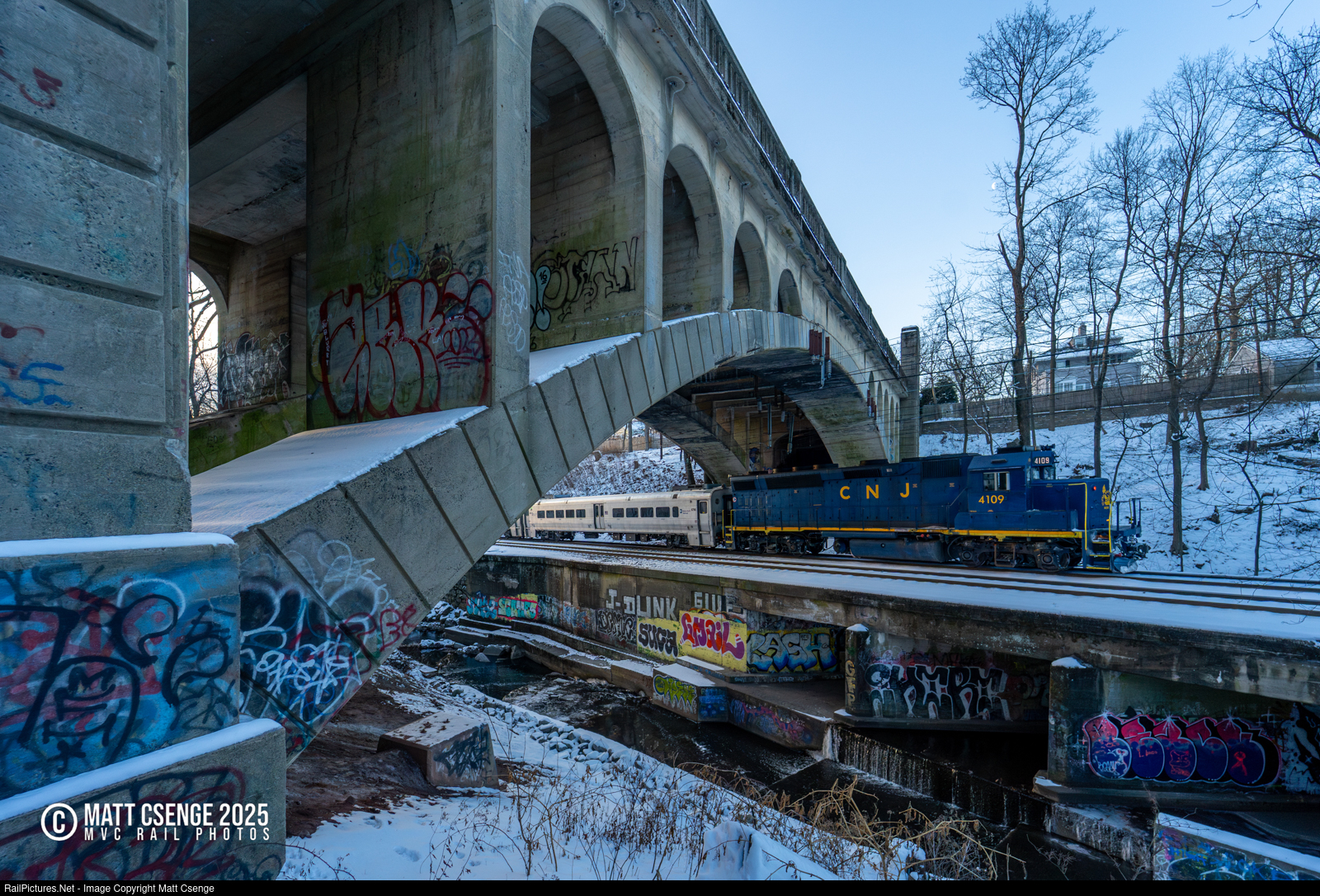 Blue Below the Bridge. NJ Transit GP40PH-2 no. 4109 is seen shoving Montclair-Boonton Line train 1002 under Freeman Pkwy in Glen Ridge, bound for Hoboken.