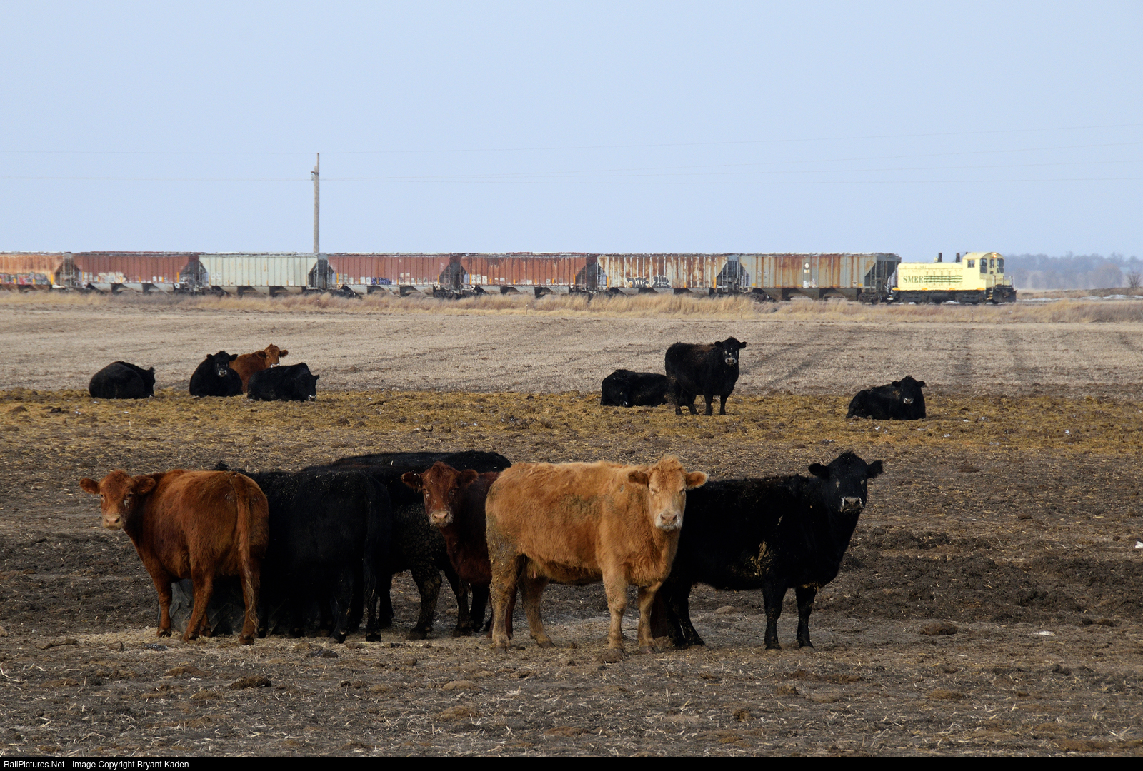 Some bovine creatures look curiously at the pair of photographers standing in the middle of nowhere on a freezing cold day as a Sisseton Milbank train continues its slow trek south between its two namesake towns.
