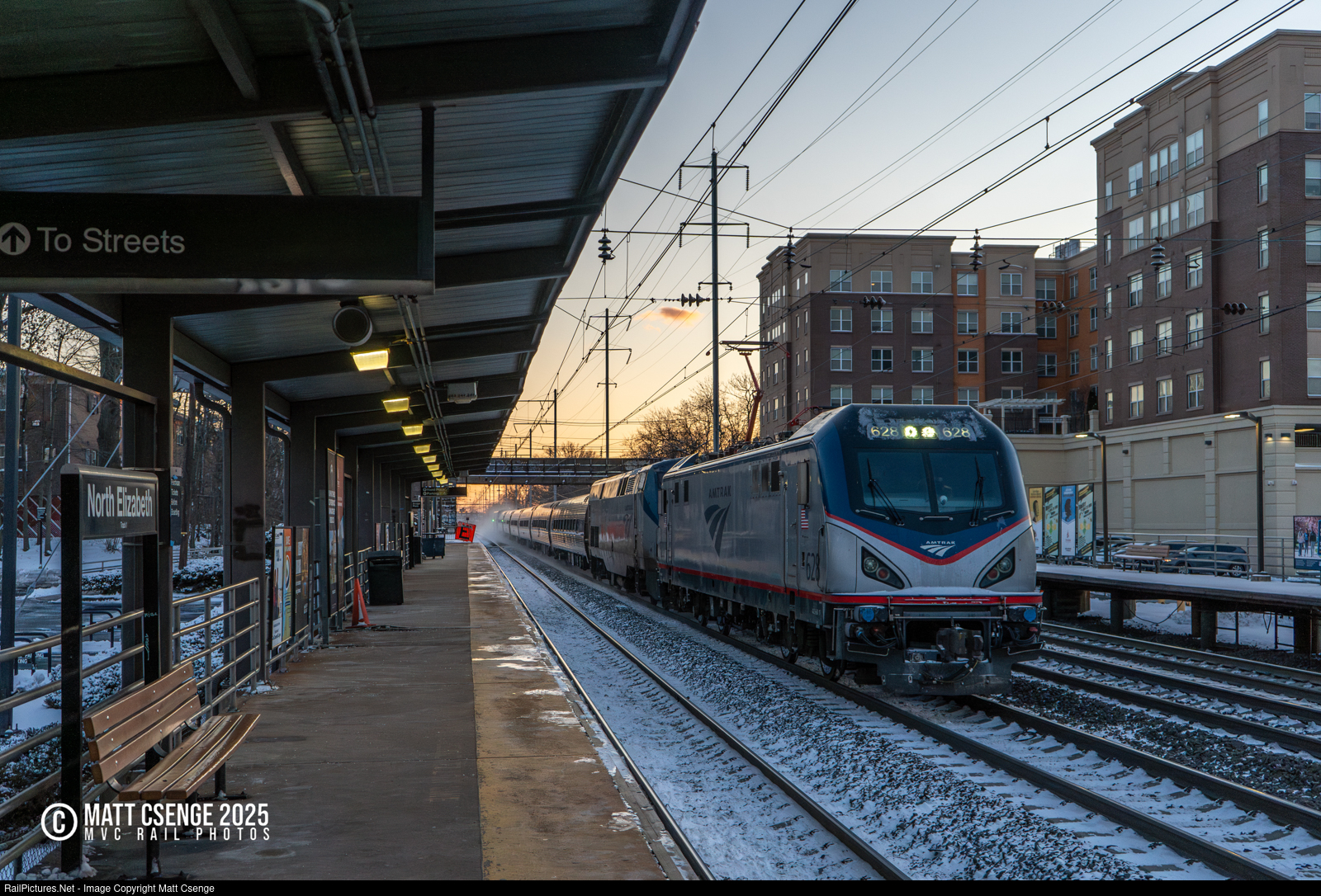 Amtrak ACS-64 no. 628 is seen leading Pennsylvanian train 42 through North Elizabeth Station. Second in the consist is P42DC no. 129, hitching a ride up to New York City from Pennsylvania. |