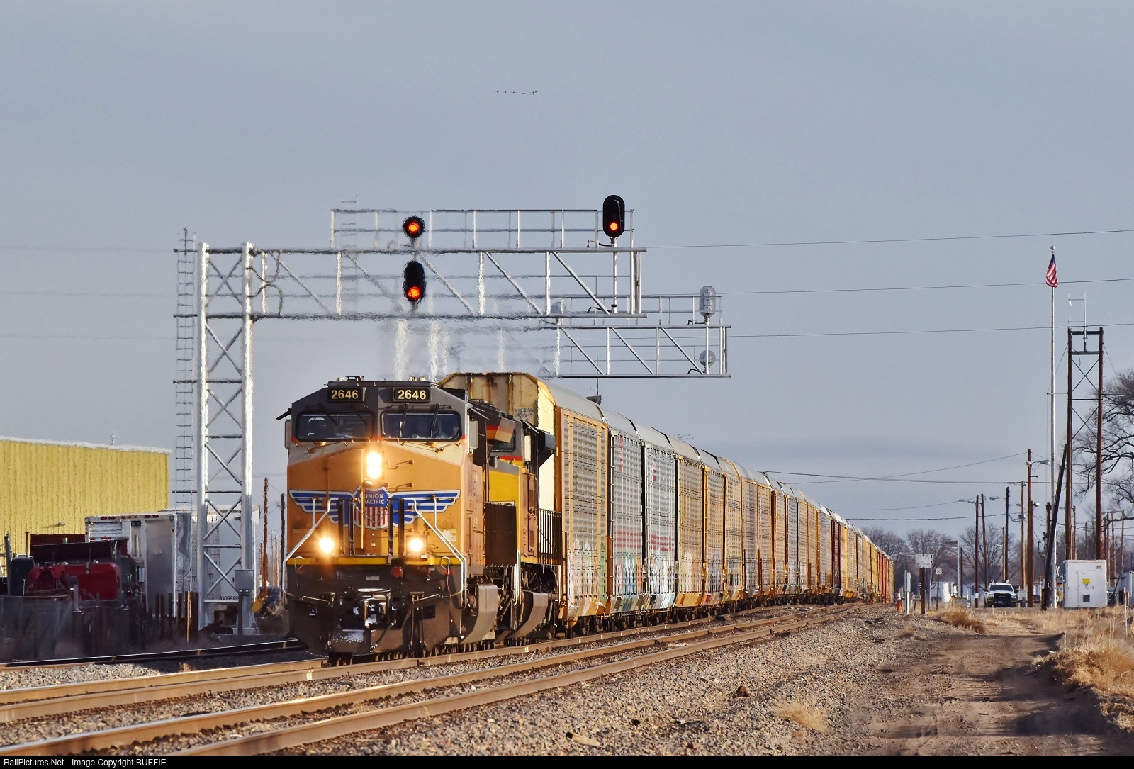 | UP 2646 (ET44AH) runs under the cantilevered signals as it leaves LaSalle, Colorado and heads to Denver on the Greeley Sub.