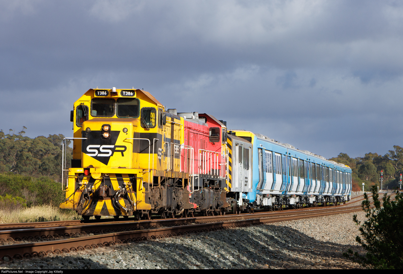 SSR’s T386 & P12 pause at Bank Box Loop with Melbourne’s first X’trapolis 2.0 train set. The train would be dropped off at Newport where it will undergo testing and commissioning.