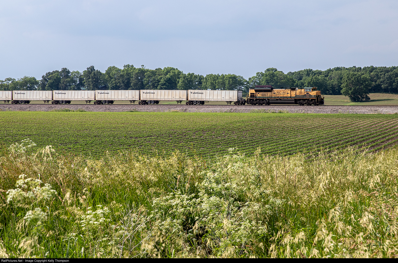 NS 1067 leads a hot shot roadrailer train east towards Peru on a muggy summer evening.