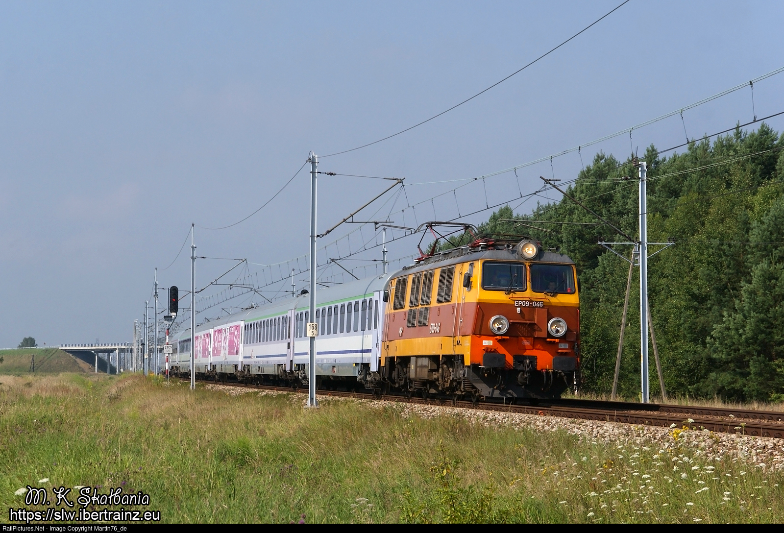 The electric locomotive EP09-046 hauling a passenger train EIC "Sawa" from Krakow Glowny to Warszawa Wschodnia.