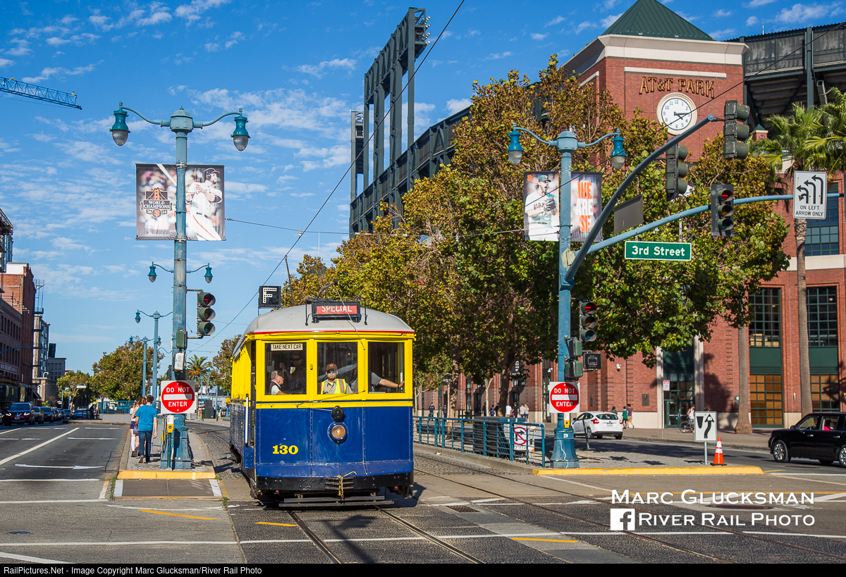Iron Monster. SFMTA/Market Street Railway "San Francisco Municipal Railway" 130 (Jewett, 1914) was passing by King Street & 3 Street near AT&T Park in San Francisco, California on the afternoon of September 26, 2015 after a day of operation during that year's Heritage Festival. The 125 cars in this order were nicknamed "Iron Monsters", and operated in regular service until 1958. Due to the diligence of certain employees, the car was retained in work service and restored to the blue and gold “Treasure Island" paint scheme for the first Trolley Festival in 1983. In this picture, the F Line sign was still up, but the "Take Next Car" sign in the window reflects that the car was out of service for the day and traveling to the MUNI Metro East Facility. To date this is the last Heritage Festival to include 130, as shortly afterwards the car was removed from service and is presently awaiting repairs.