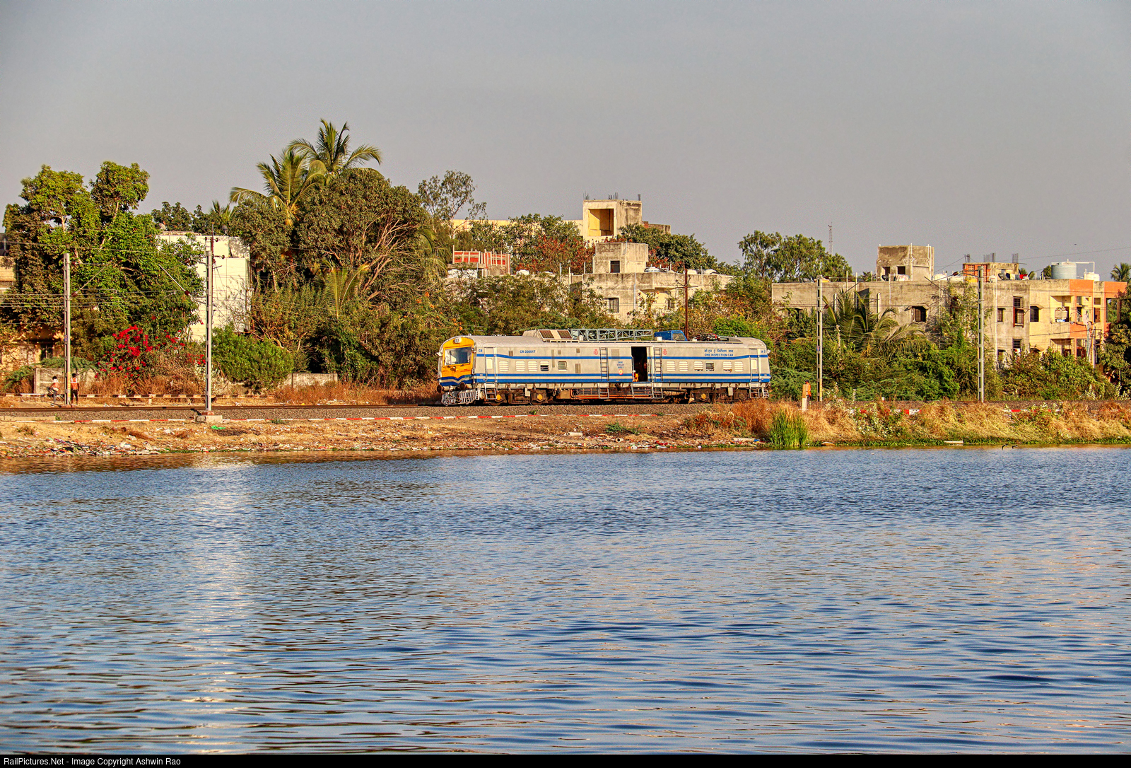 Self propelled OHE inspection van basking in the evening light near Solapur home signal. Kamar Talab Lake, Solapur.