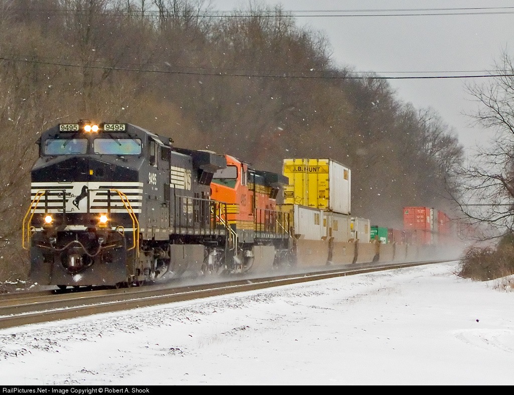 NS 25K rolls west in snowy conditions with an NS/BNSF combo.
