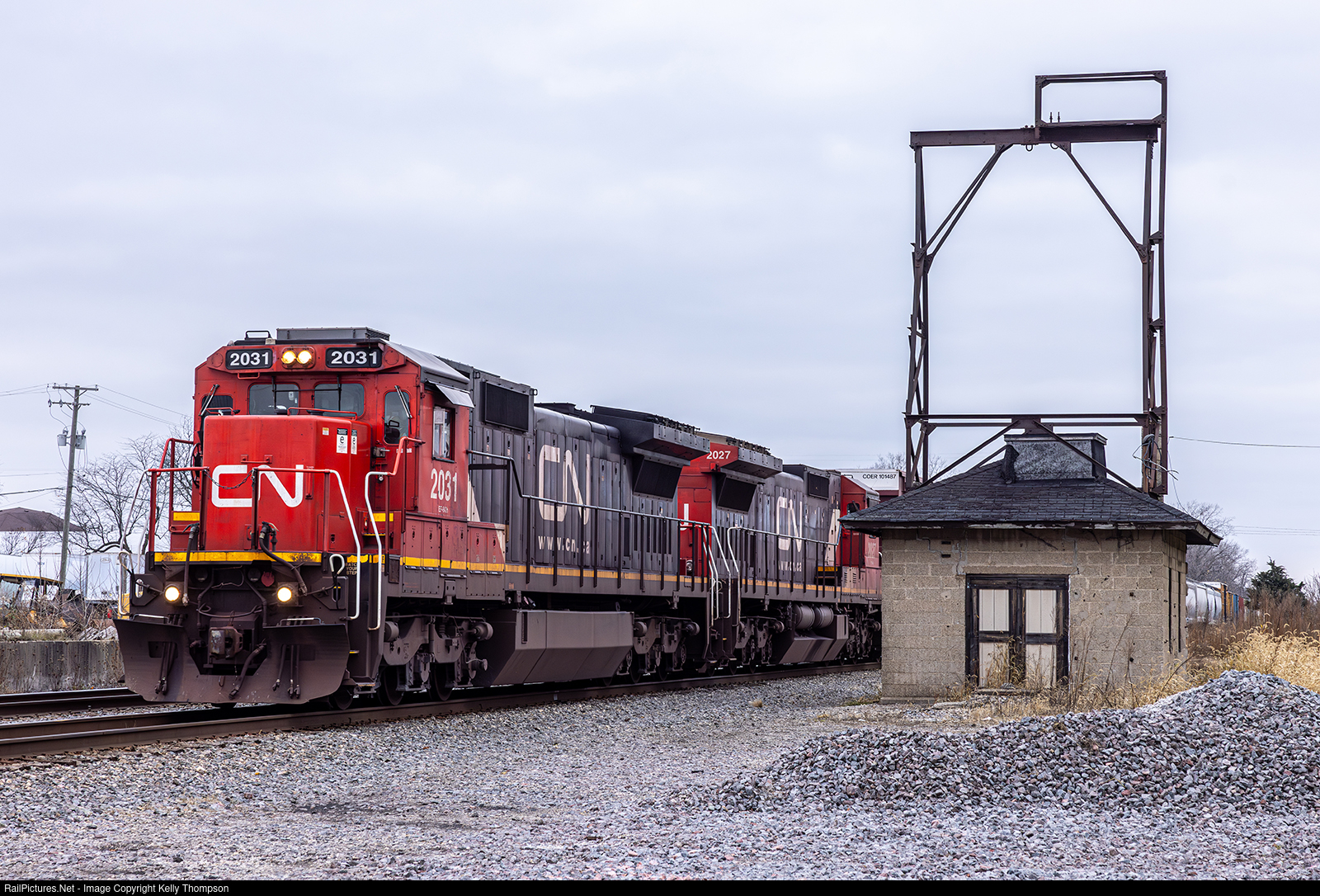 CN 2031 leads their A490 train east as they pass the old EJE maintenance shack in Frankfort.