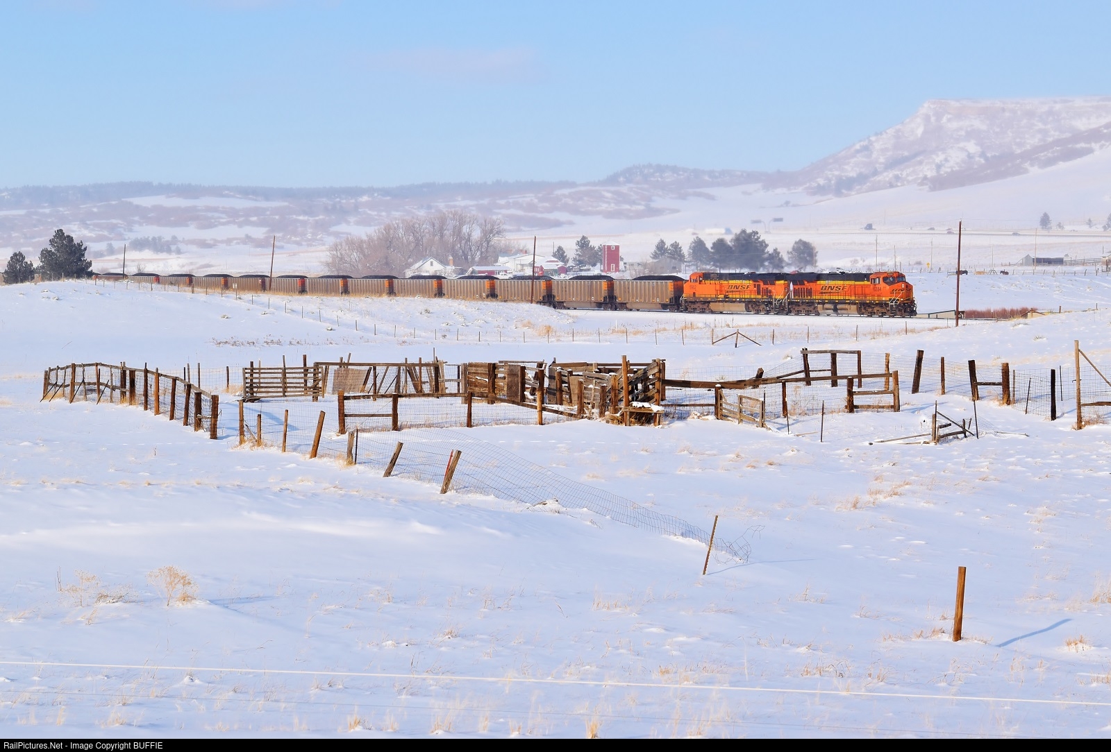BNSF 6284 (ES44AC) leads a loaded coal train through a snowy Greenland, Colorado and past some old livestock pens.