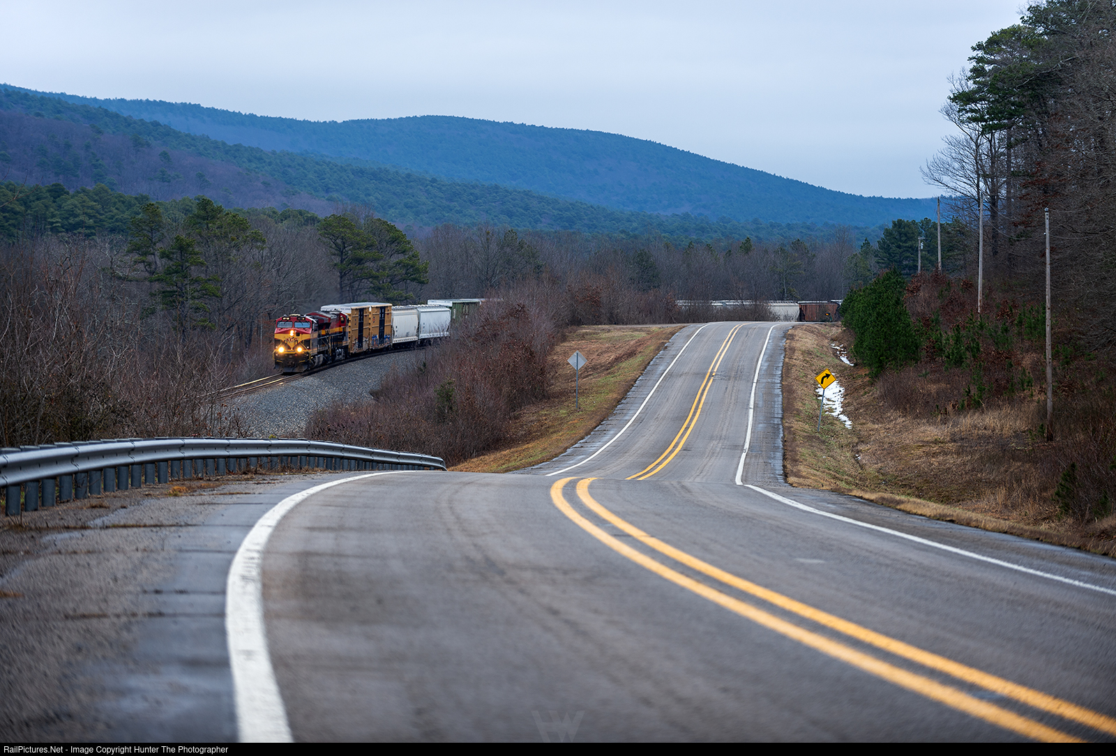 | Running alongside US Highway 270, a northbound CPKC manifest train has just crested the grade at Rich Mountain, AR late in the day on a chilly Sunday, January 26, 2025.