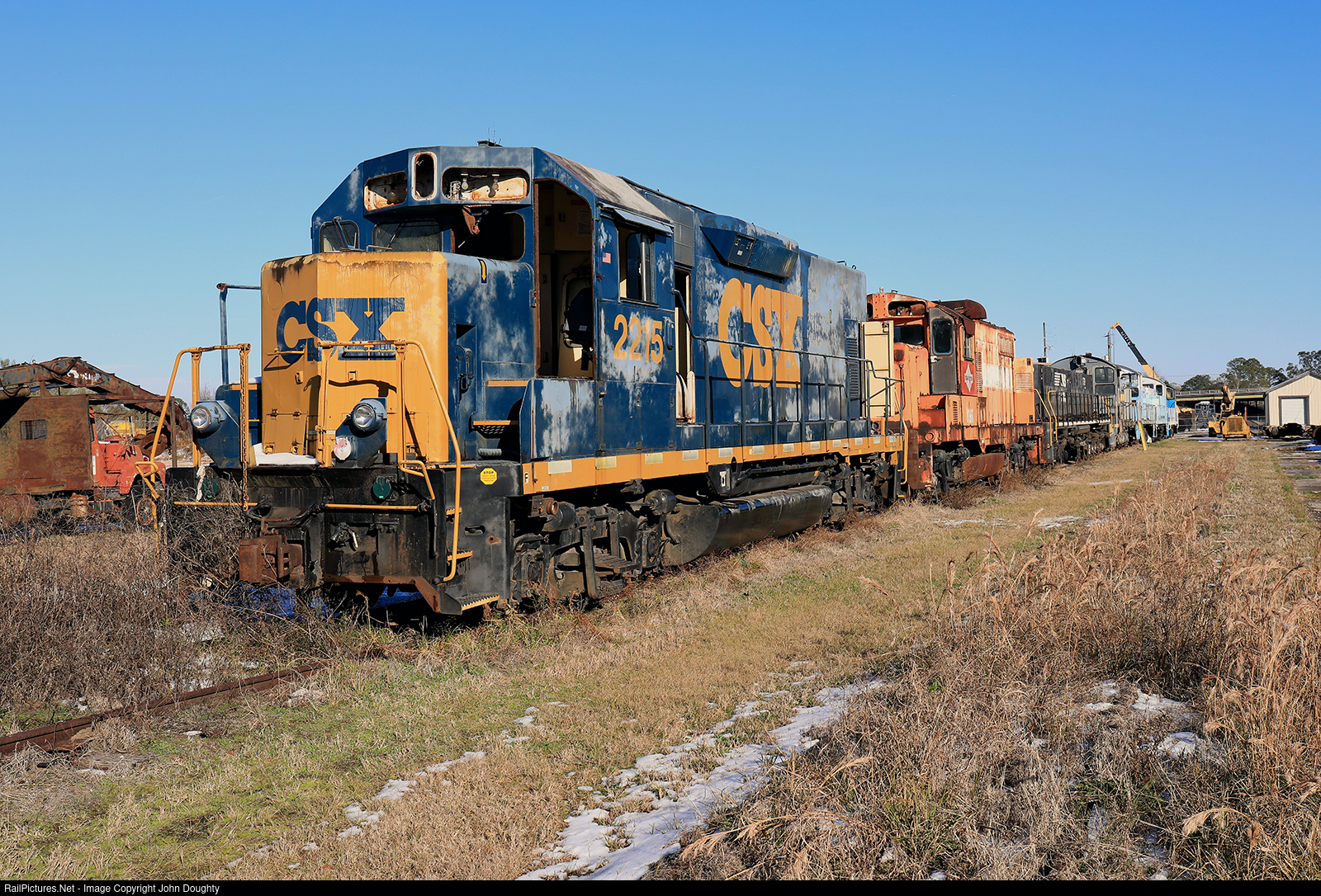 CSX 2215 and a colorful line of locomotives sit at the Locomotive Specialist facility, as snow from a rare winter storm that dumped 2-4 inches on Waycross, Georgia, which was a record, continues to slowly melt. With a nighttime temperature of 27 degrees, it is taking more than a few days for the snow to melt. Photo taken with permission from owner of LOSX.