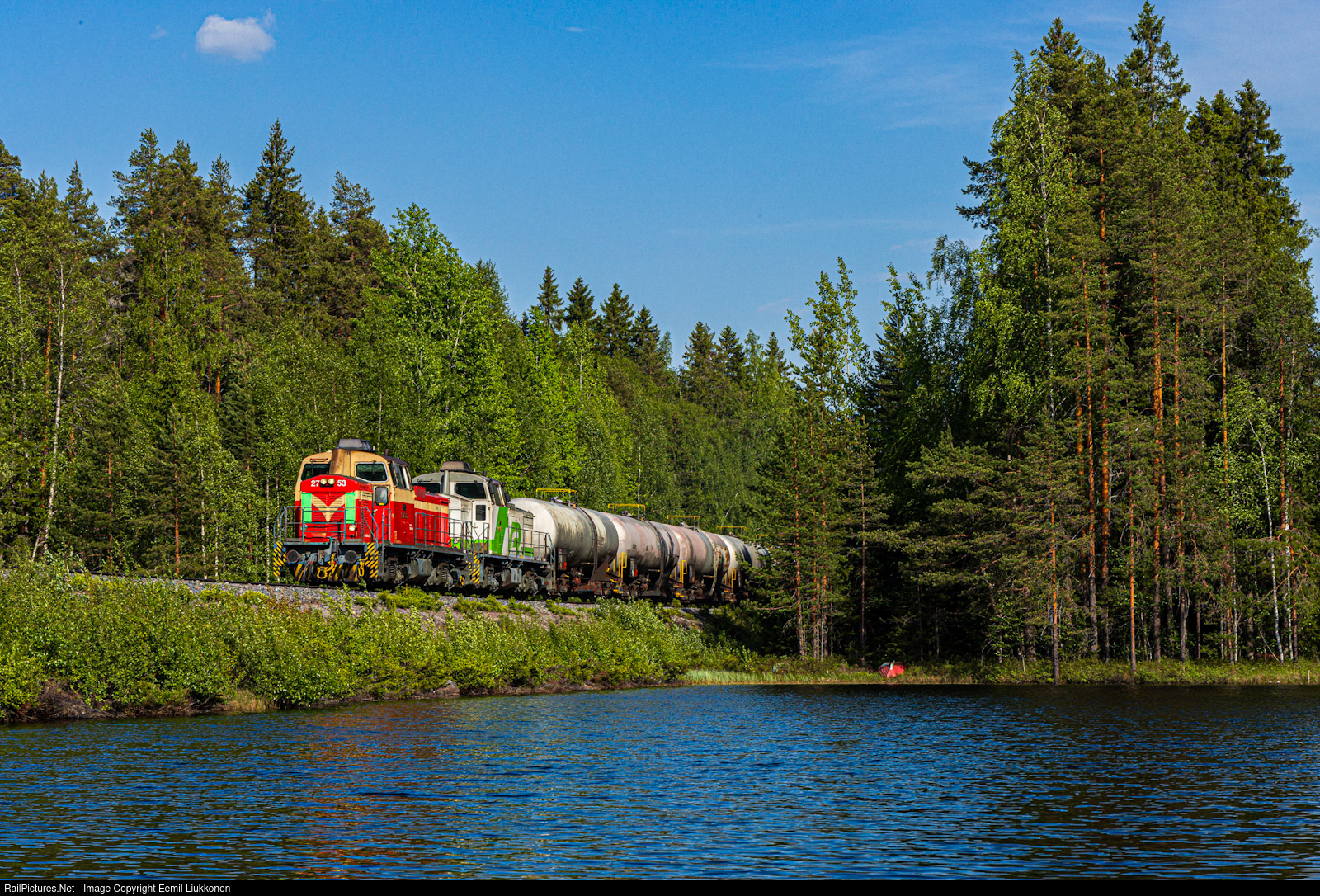 | Remembering summer while the weathers are cold. Going back all the way to previous May while being in the nature near Pieksämäki, an empty tanker train from Varkaus to Kotka is nearing Pieksämäki while the two class Dv12s appear behind the forrest and soon they will cross the small rail bank of Pieni Tulilampi pond. After arrival in Pieksämäki, the two diesel will call it a day as the locomotive is switched to electric. Nowadays the appearance of these classic class Dv12s are rare on these trains as the new class Dr19 has found its way of being responsible for hauling these trains. |