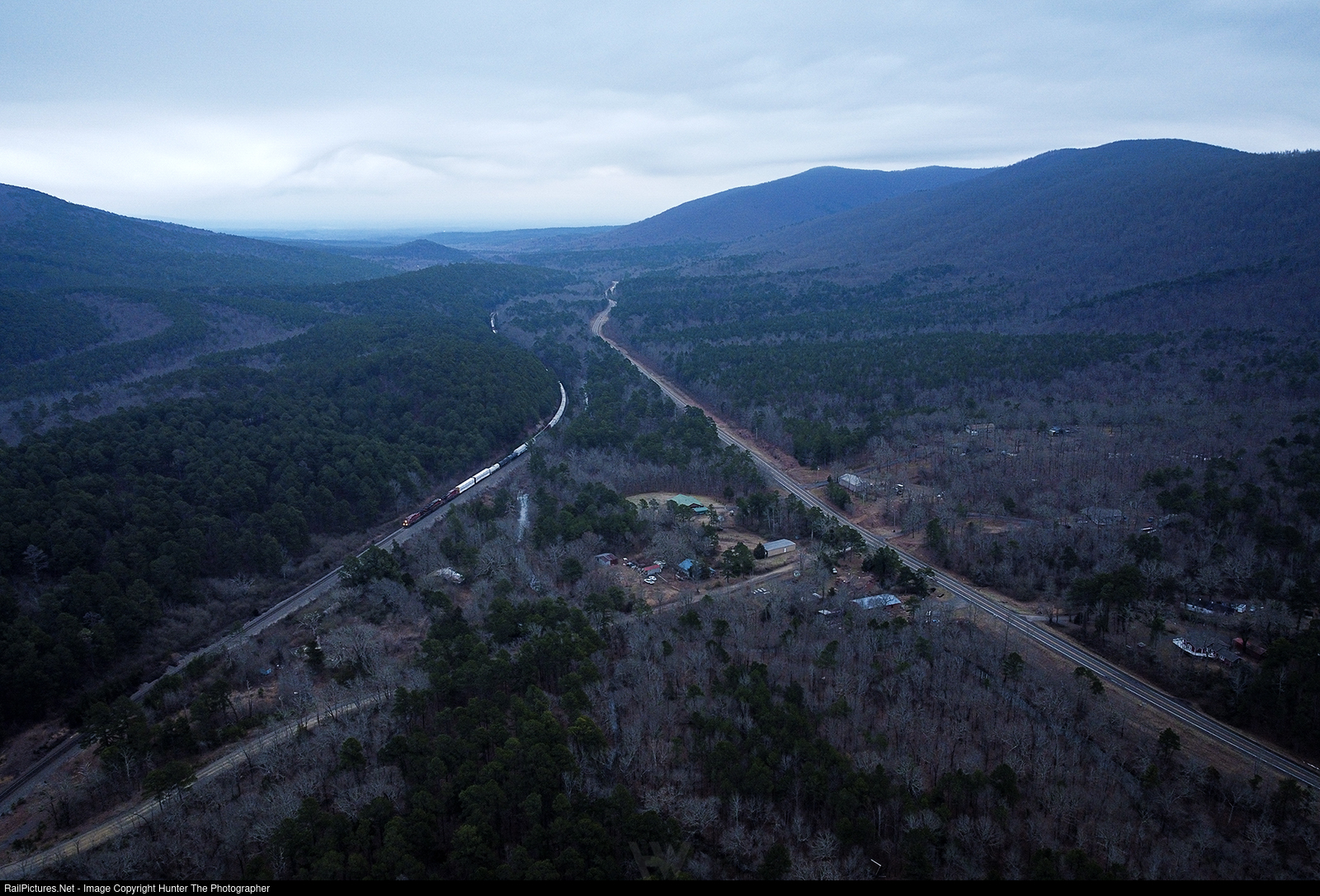 | As the sky begins to darken over the community of Eagleton, AR on the evening of Sunday, January 26, 2025, a northbound CPKC manifest train climbs up the eastern (timetable southern) slope of the Rich Mountain grade.