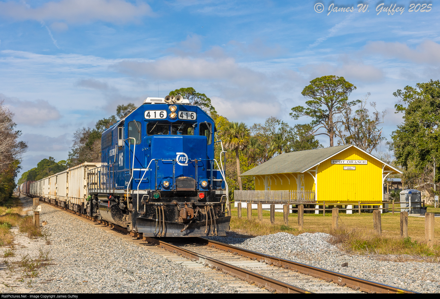 | Florida East Coast local 910 (New Smyrna Beach to Harwood Siding), makes the run south to NSB, passing the Port Orange depot. |