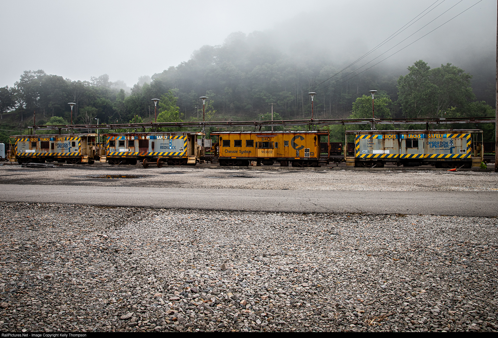 | CSX's Hazard Yard sits quiet and empty as we find four old cabooses waiting for their turn to be used down mine spurs. BO 903032 is a blast from the past, still sporting its Chessie paint scheme. |