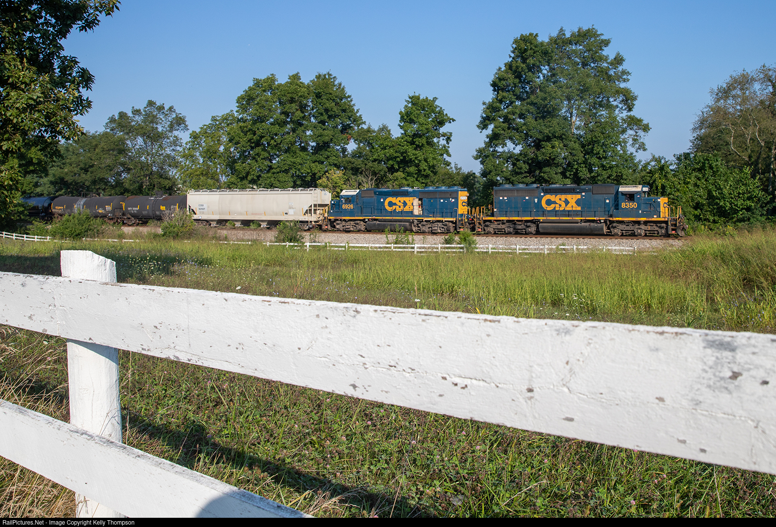 | CSXT 8350 runs east at track speed as they pass the horse farms at Verona, just outside of Cincinnati. |