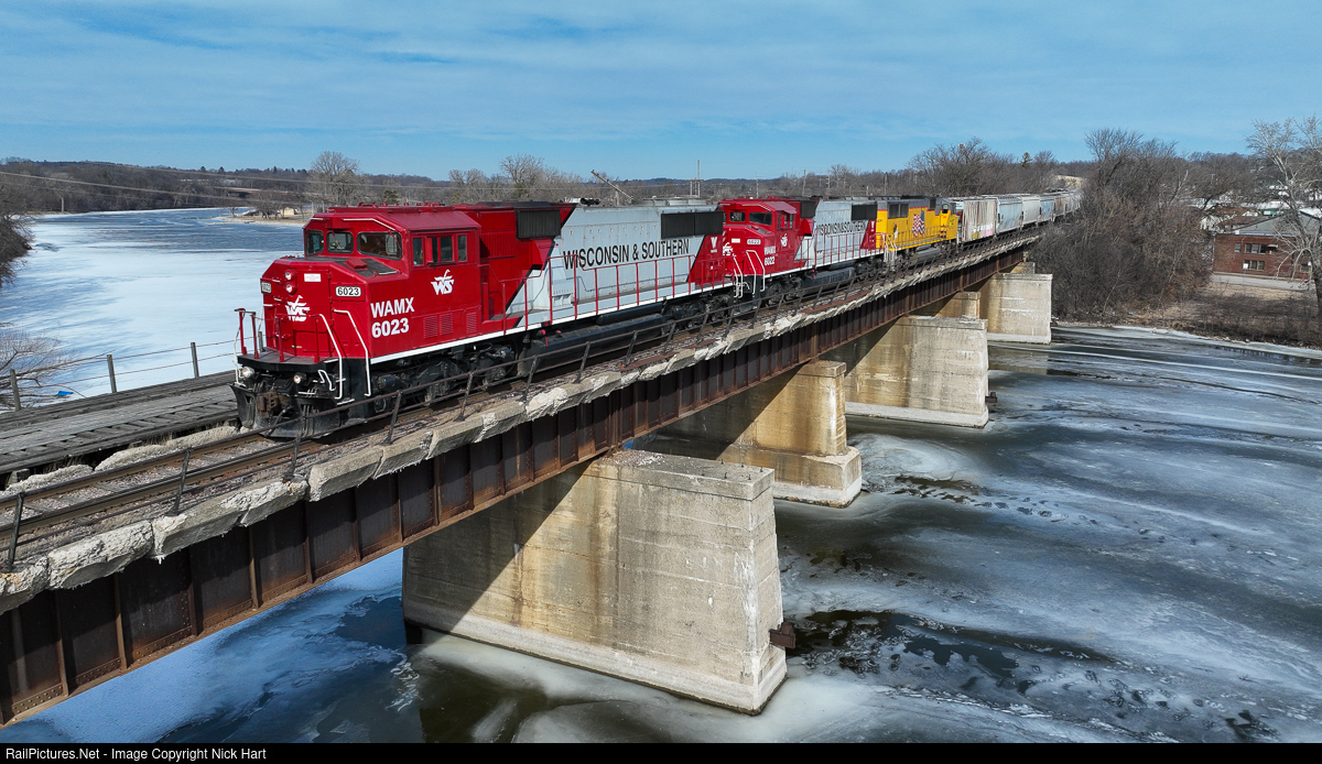 | A trio of SD60M's, the first two in WSOR paint and the third in UP yellow, lead T004R over the Rock River in Janesville. This would the first of two times the train would cross the river. |