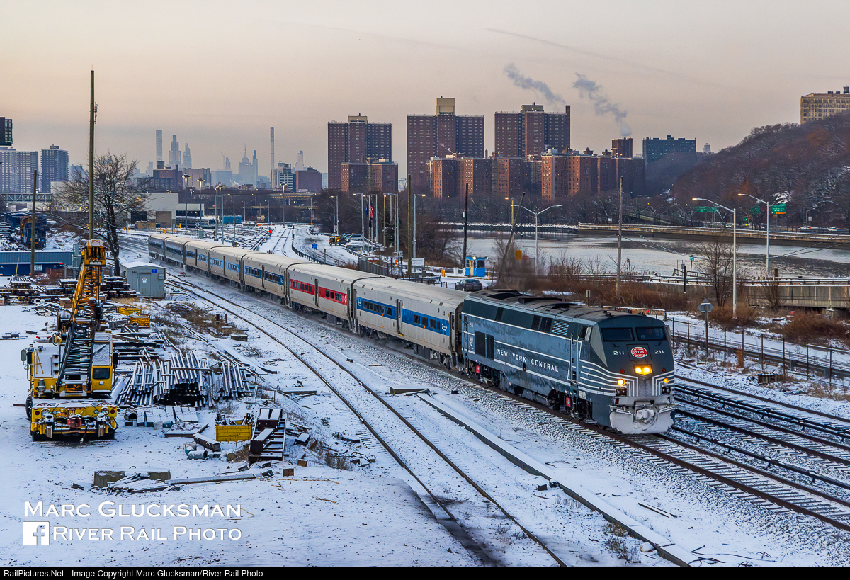 Lightning Stripes In Just Enough Snow. Overnight snow coats the ground in the Bronx, New York on the morning of Monday, February 3, 2025 as MTA Metro-North Railroad Train 805 passes through the High Bridge area with MNCW 211 (New York Central Tribute) unit leading. In the background is the Metro-North Highbridge Yard, constructed as a midday layover facility to replace space lost in Grand Central Terminal for the construction of East Side Access. In the background, the Manhattan skyline rises above the scene.