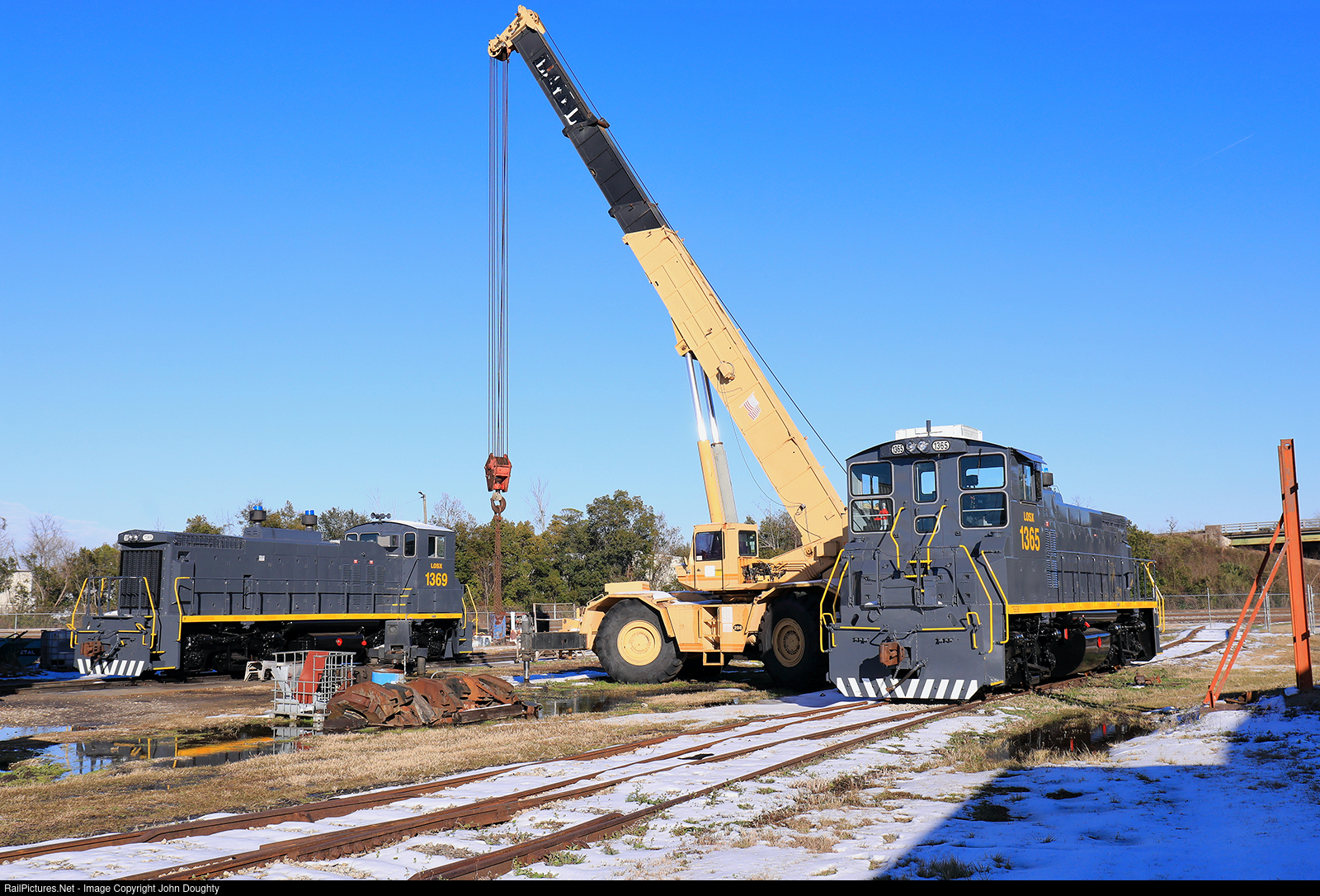 | LOSX 1365 and 1369 are getting close to having all their rebuild work done as they sit in the melting snow in Waycross, Georgia. A rare winter storm dumped about 4 inches of snow in Waycross. Photo taken with permission. |
