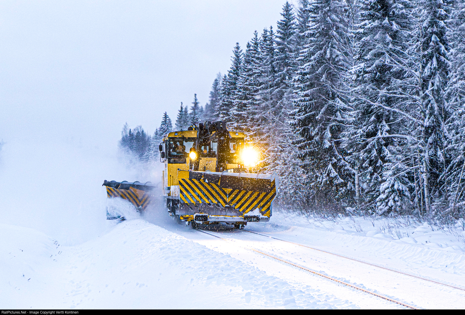 Since this winter turned out to be quite bad in terms of snow depth, let's go a year back in time to Haapamäki-Jyväskylä line where Destia Rail Tka7 226 was widening snow banks after a heavy snowfall. The line itself had been cleared earlier.