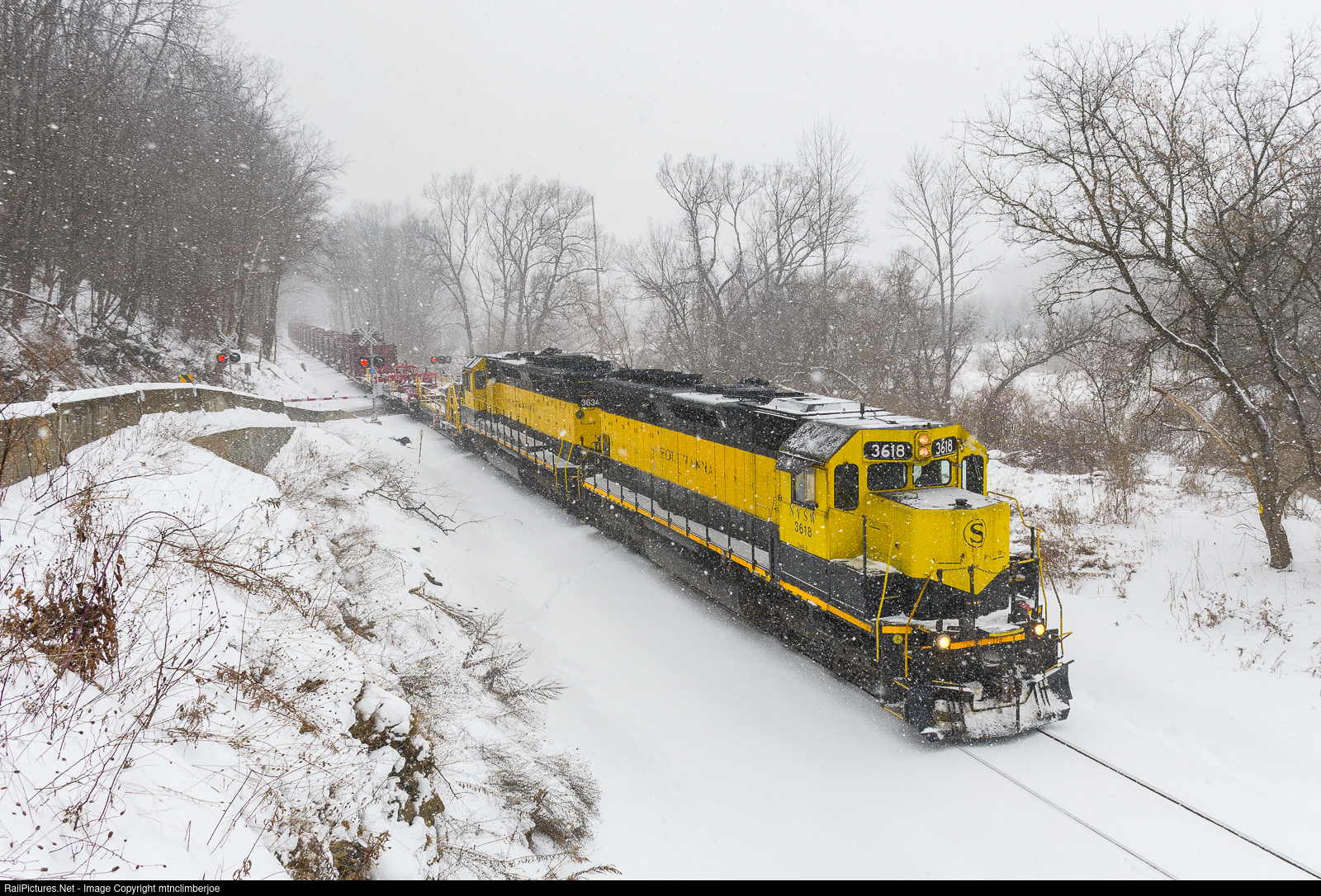 After spending the morning working with the CL-2 crew to get both jobs ready, the New York, Susquehanna & Western's CL-1 job gets on the move south from Cortland, New York as another snow squall moves through the valley. The railroad's two SD45's provide the power, taking an empty welded rail trainset and one covered hopper to Binghampton.