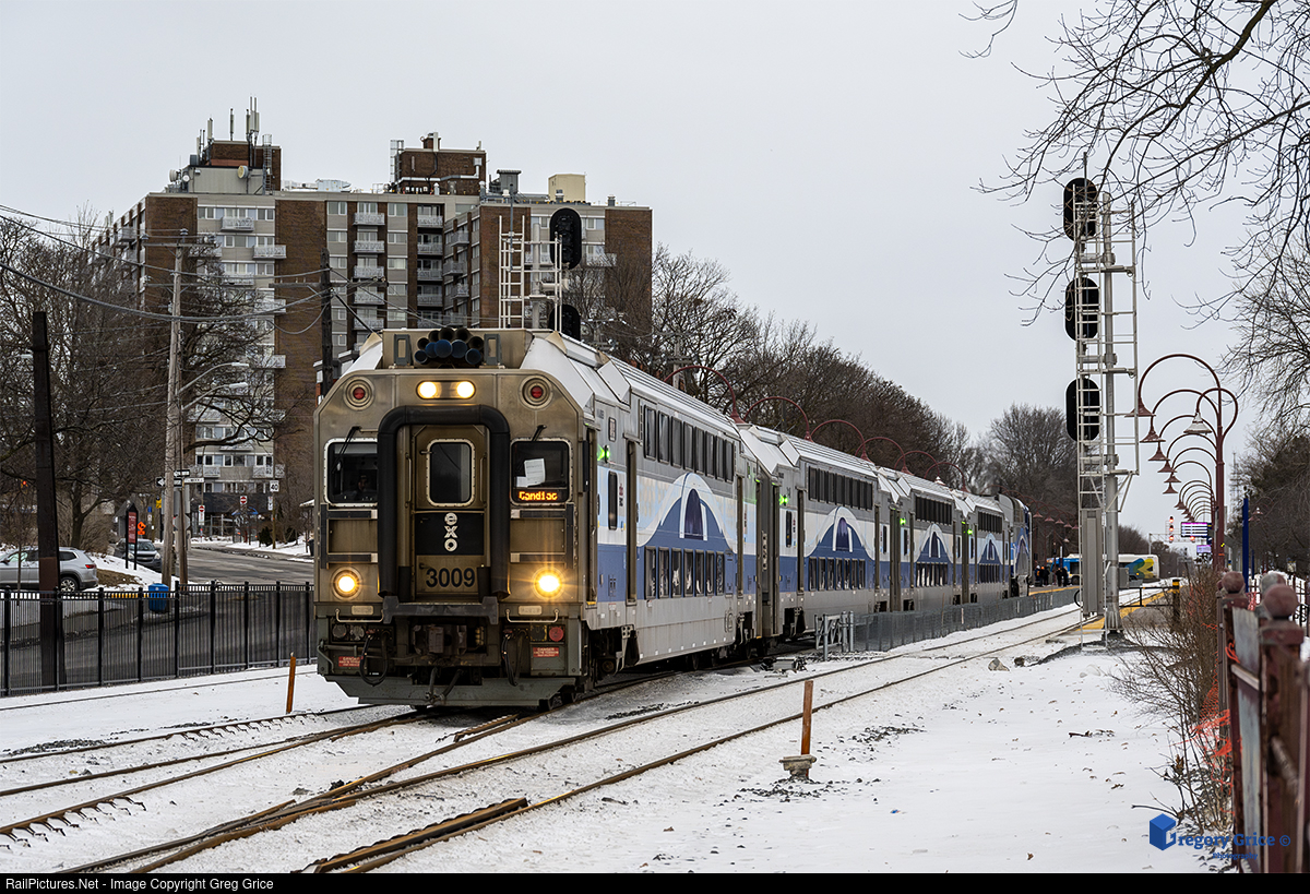 On the afternoon of January 27, 2024, Exo Candiac Line Train 81, with Bombardier Multilevel Cab Car 3009 leading, crosses over towards the South Jct Lead while departing Montreal West Station on the CPKC Westmount Subdivision in QC, Canada.