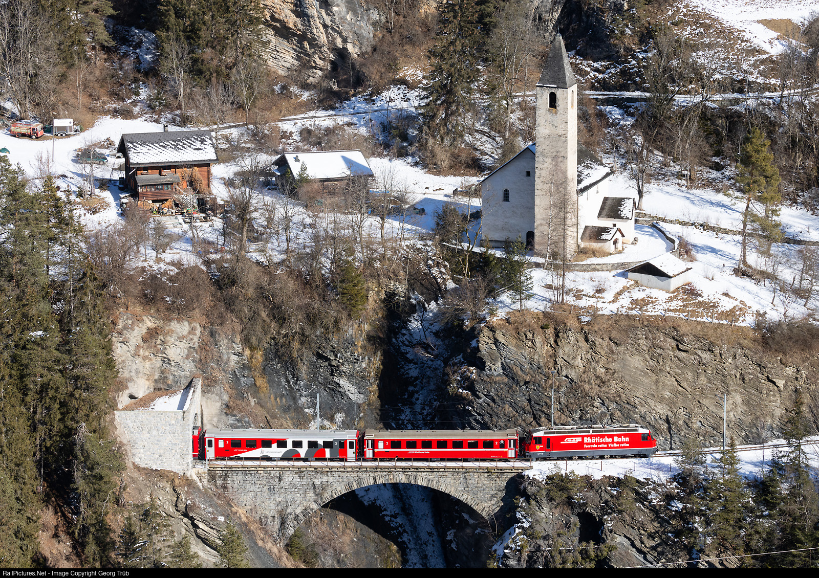 | Ge 4/4 III # 643 "Vals" of the Rhaetian Railway shoves the Interregio 1136 of the line IR38 from St.Moritz over the Albula line to Chur, crossing the Mistailtobel viaduct and entering the 300 meter long Mistail tunnel in the Schin gorge between Tiefencastel and Solis. In the consist is the second class standard type II # 2383 in the special "Landwasserwelt" paint scheme. This carriage will be used in the Landwasser Shuttle between Filisur and Alvaneu from summer 2025. Above is the St.Peter Mistail church, probably from the 9th century, a carolingian three-apsidal church. |