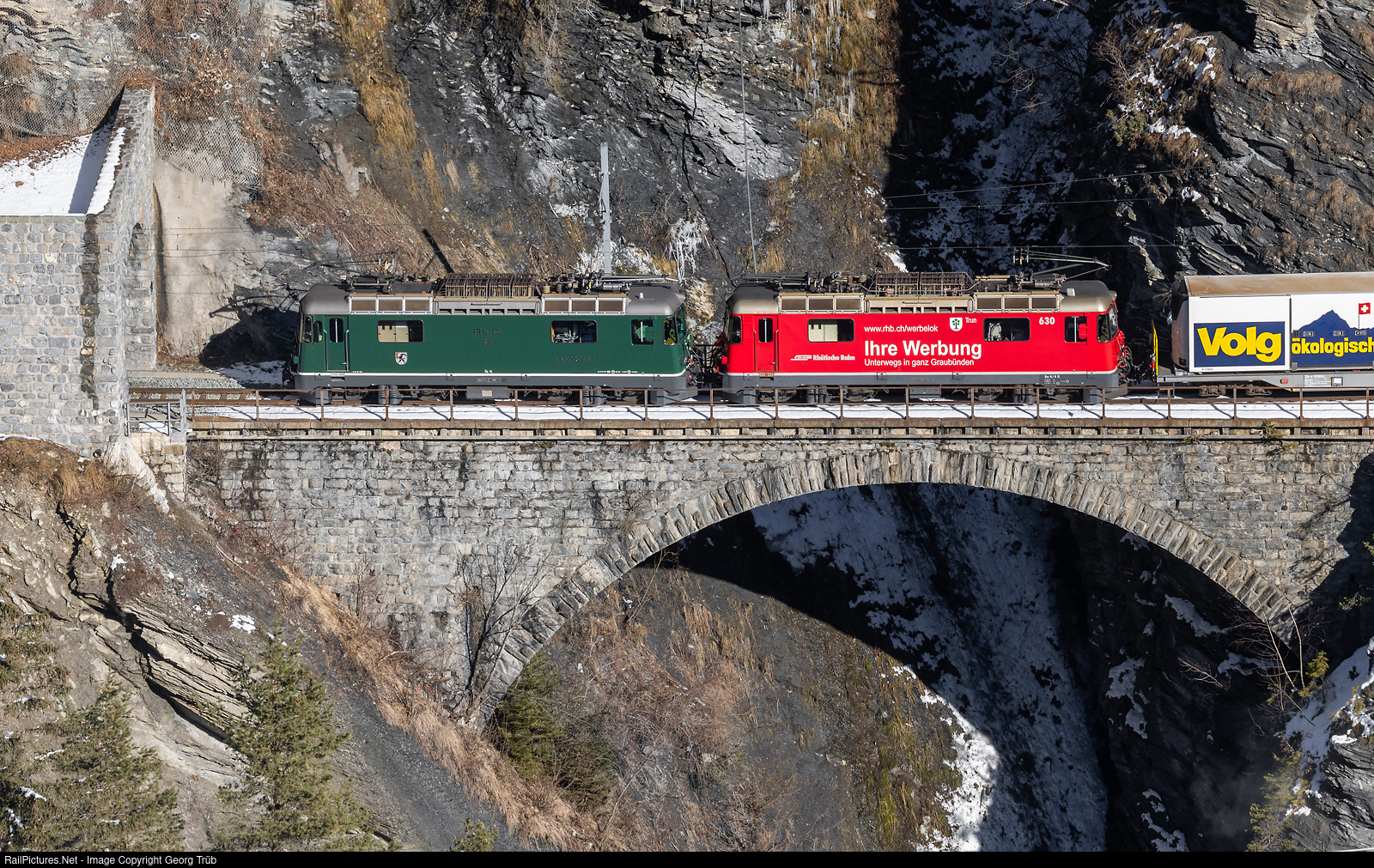 | Locomotives Ge 4/4 II # 611 and # 630 of the Rhaetian Railway in multiple control are crossing the Mistailtobel viaduct and entering the Mistail tunnel in the Schin gorge between Tiefencastel and Solis, pulling the freight train 5140 from Pontresina over the Albula line to Landquart freight yard. # 611 "Landquart", delivered in 1973 as first of the series, got the original green paint scheme back in april 2024. |