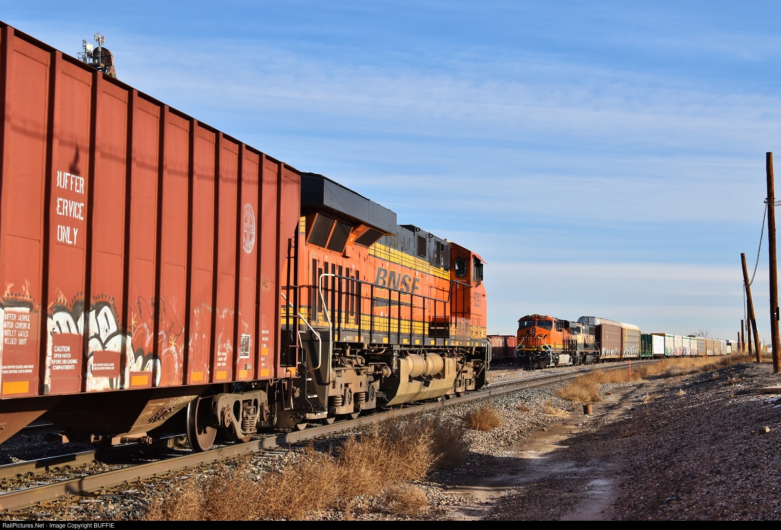 Two BNSF trains meet at Hudson, Colorado on the Brush Sub.