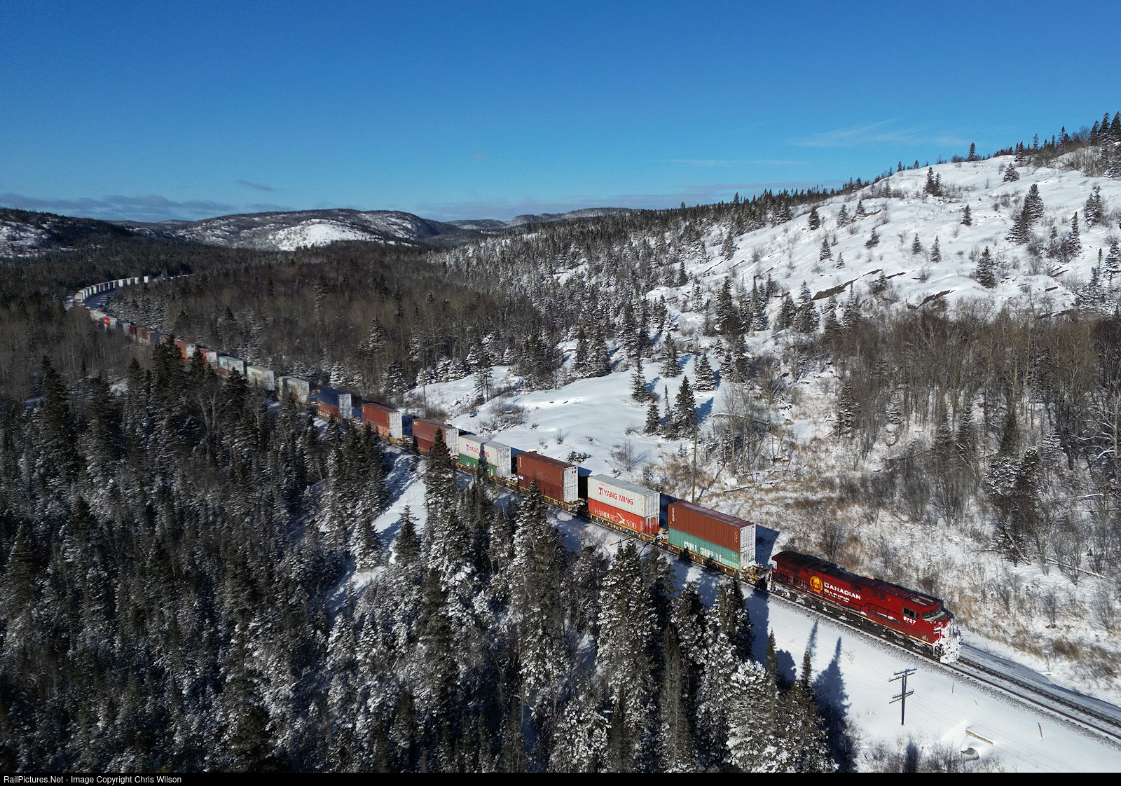 CP AC4400CW 9727 was one of the last original AC44's to get a fresh coat of CP paint after wearing a "bio fuel" logo. This locomotive is shoving 10000ft of stacks on priority Toronto to Vancouver train 101 west of Marathon.