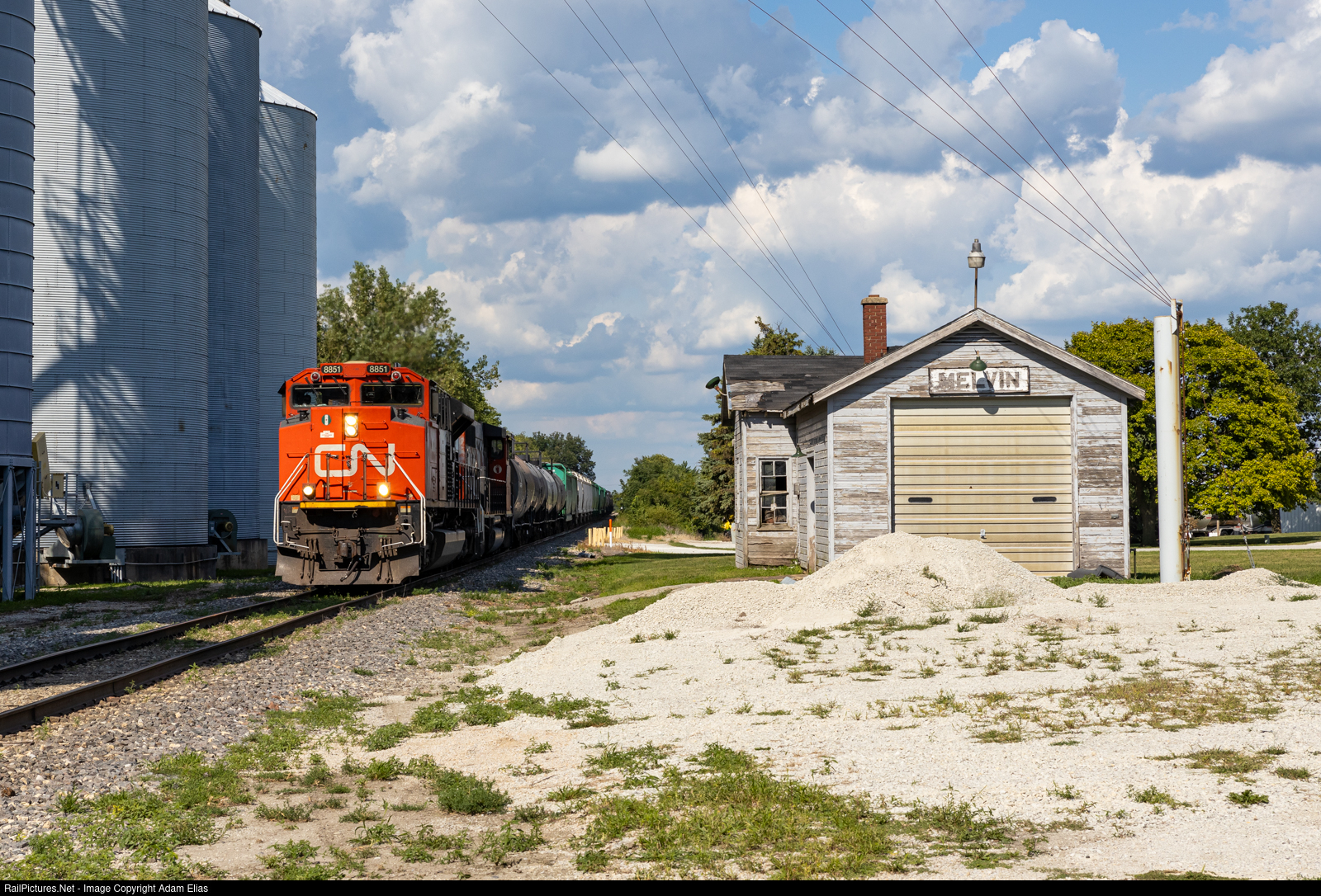 | L585 heading back towards Clinton after a day of work in Gilman passing by the old train station in downtown Melvin. I couldn't find an exact date this old depot was built, but I know it has at least been up since the 1940s. |
