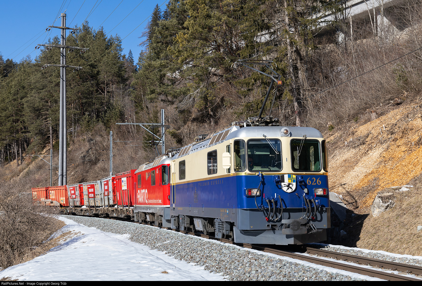 | Locomotives Ge 4/4 II # 626 in the cobaltblue/ivory paint scheme and # 615 of the Rhaetian Railway in multiple control pull the freight train 5135 from Landquart freight yard over the Albula line to Samedan between Solis and Tiefencastel. |