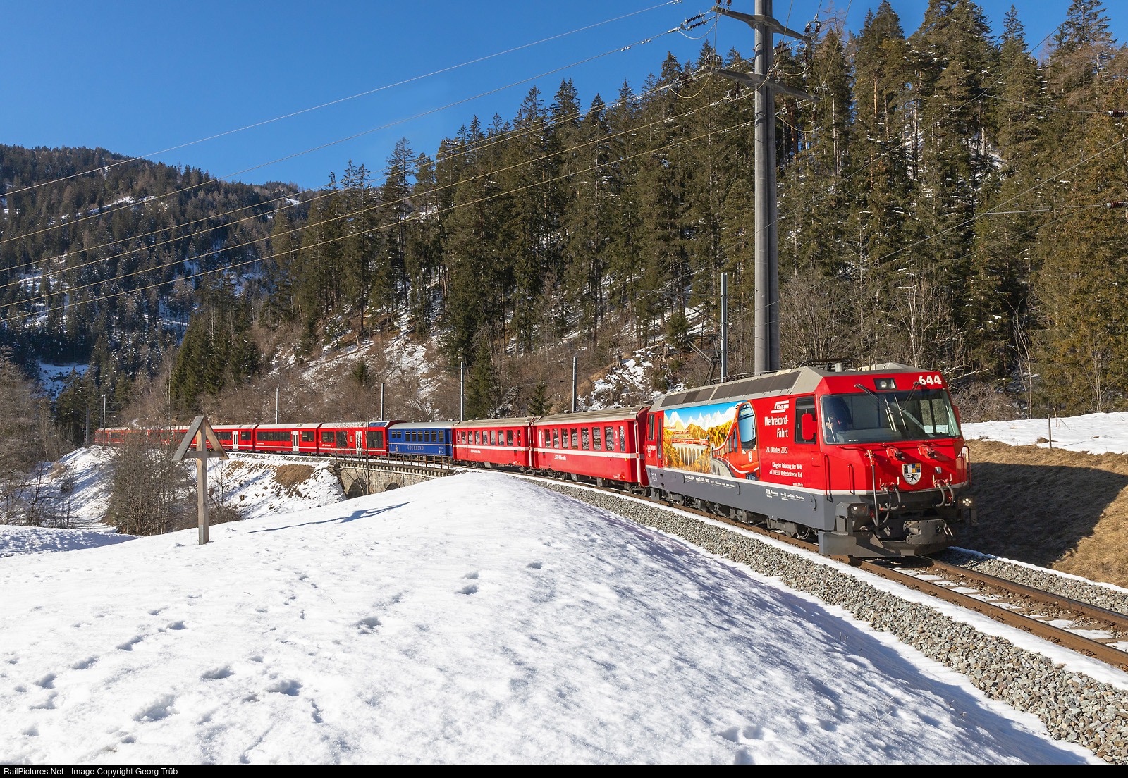 | Locomotive Ge 4/4 III # 644 of the Rhaetian Railway, in the special paint scheme "world record", pulls the Interregio 1129 of the line IR38 from Chur over the Albula line to St.Moritz, between Solis and Tiefencastel. |