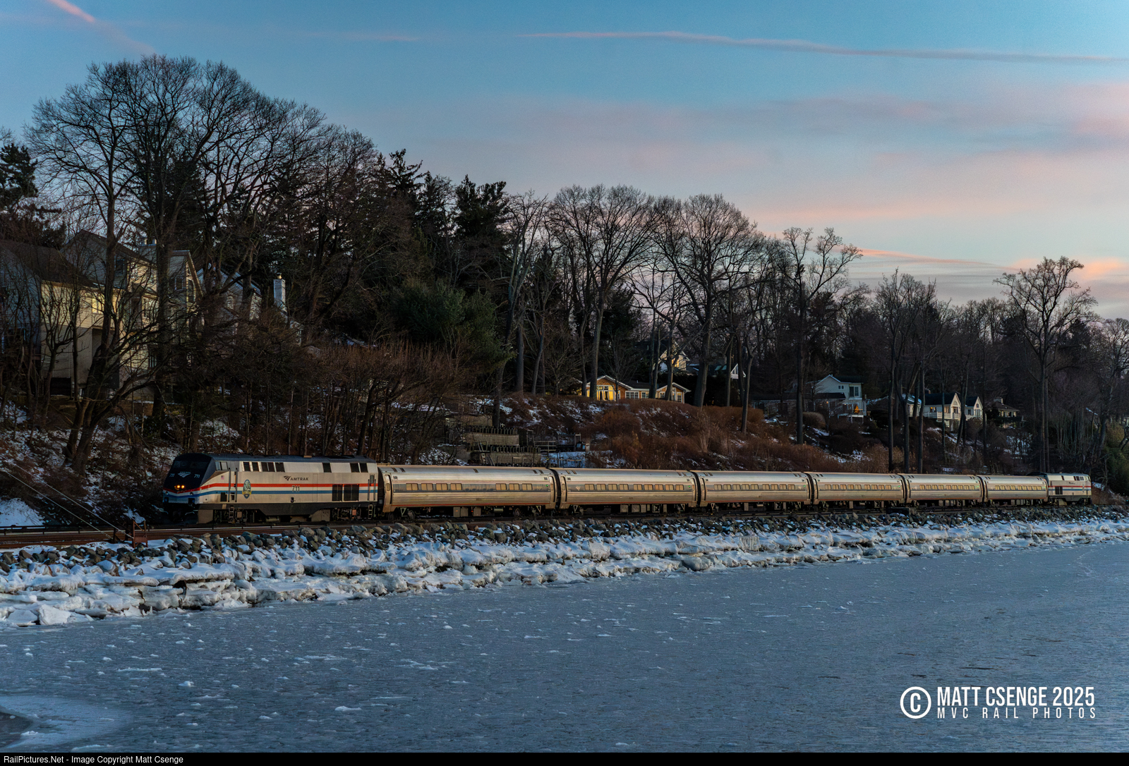 Passengers on Amtrak Empire Service train 235 were treated to an impressive sunset on the west side of the Hudson River as their train raced north a couple hours later than scheduled. From the shore the scene was a bit different, with the last rays of sunlight reflecting off the stainless steel carbodies while darkness fell over the land.