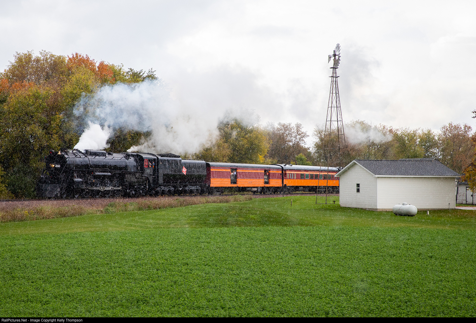 Rain pours down on Augusta as MILW 261 hauls an excursion west past the farmlands of Augusta.