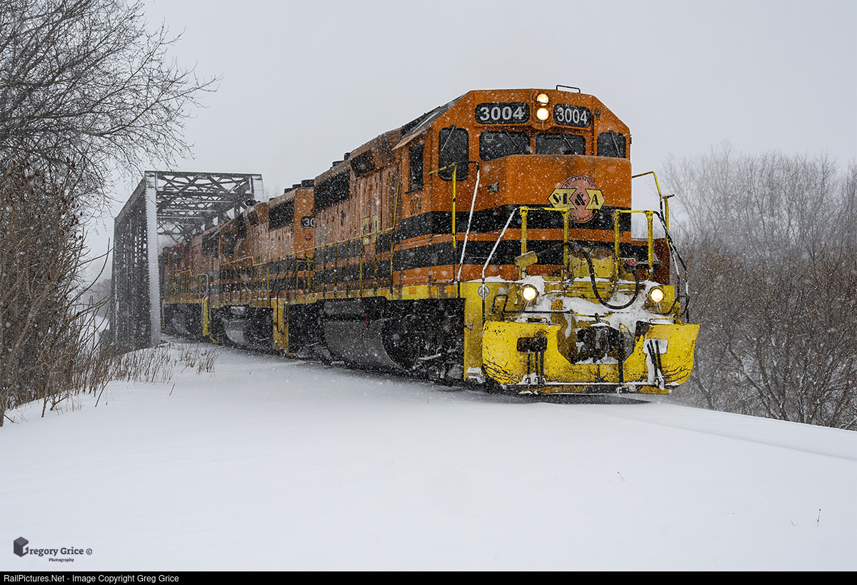 On a snowy January 29th, 2025, St. Lawrence & Atlantic Railroad train 520, led by EMD GP40-2 #3004, crosses the River Noire while traveling along the Sherbrooke Subdivision in Upton, Quebec, Canada.