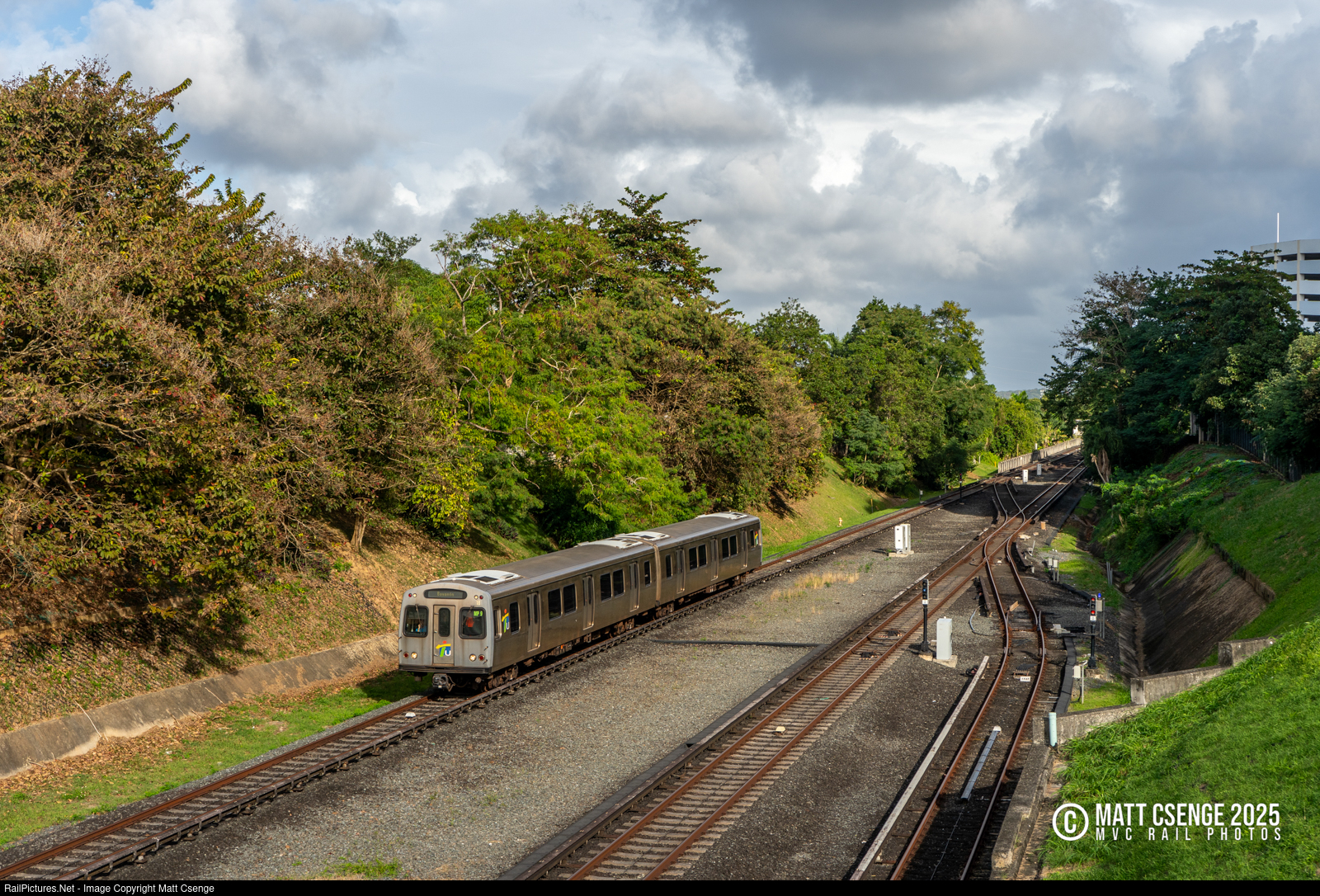 A two-car Tren Urbano train bound for Bayamón is seen approaching Martínez Nadal Station in Puerto Rico. The typically two track line widens here, with the yard lead for the Hogar del Niño Operations and Maintenance Center making up the third track through the station. |